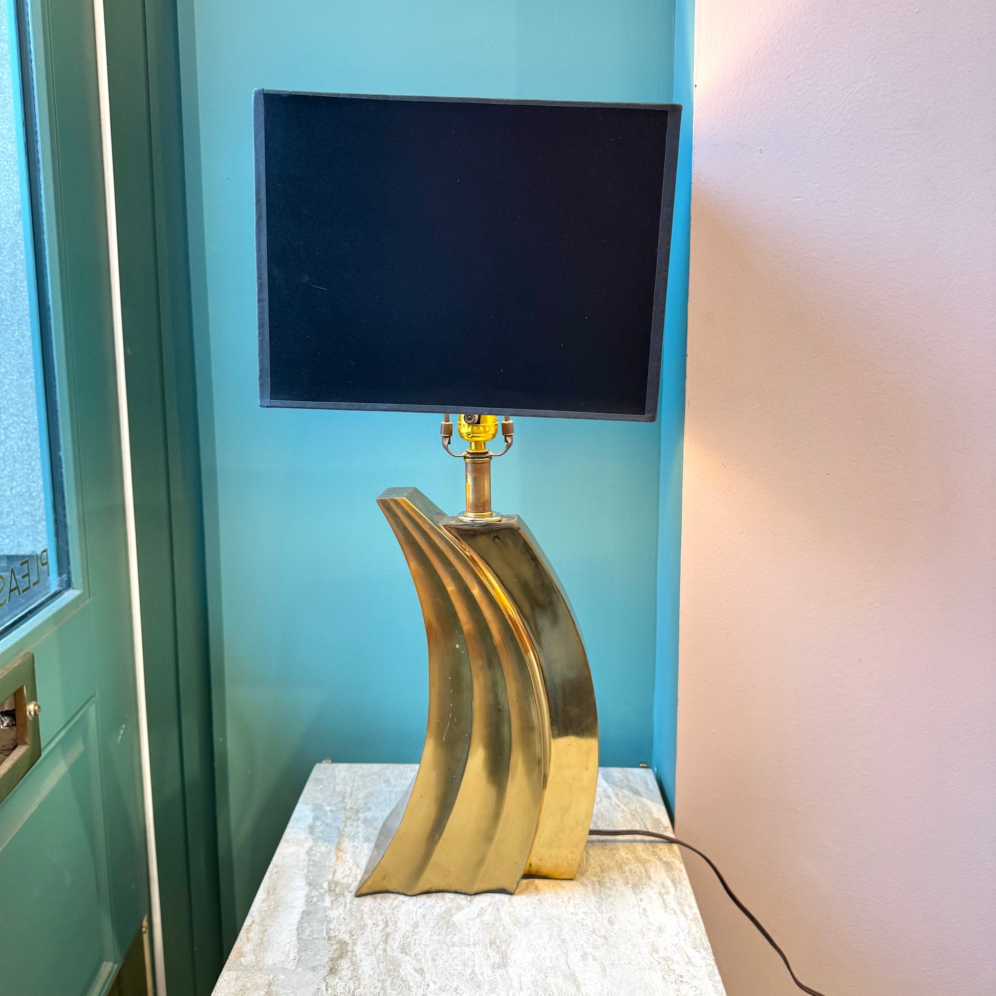 A beautiful 1970’s Pierre Cardin style brass lamp with curved, deco style design. Shade included for no additional cost. See our other listings for the matching lamp.
