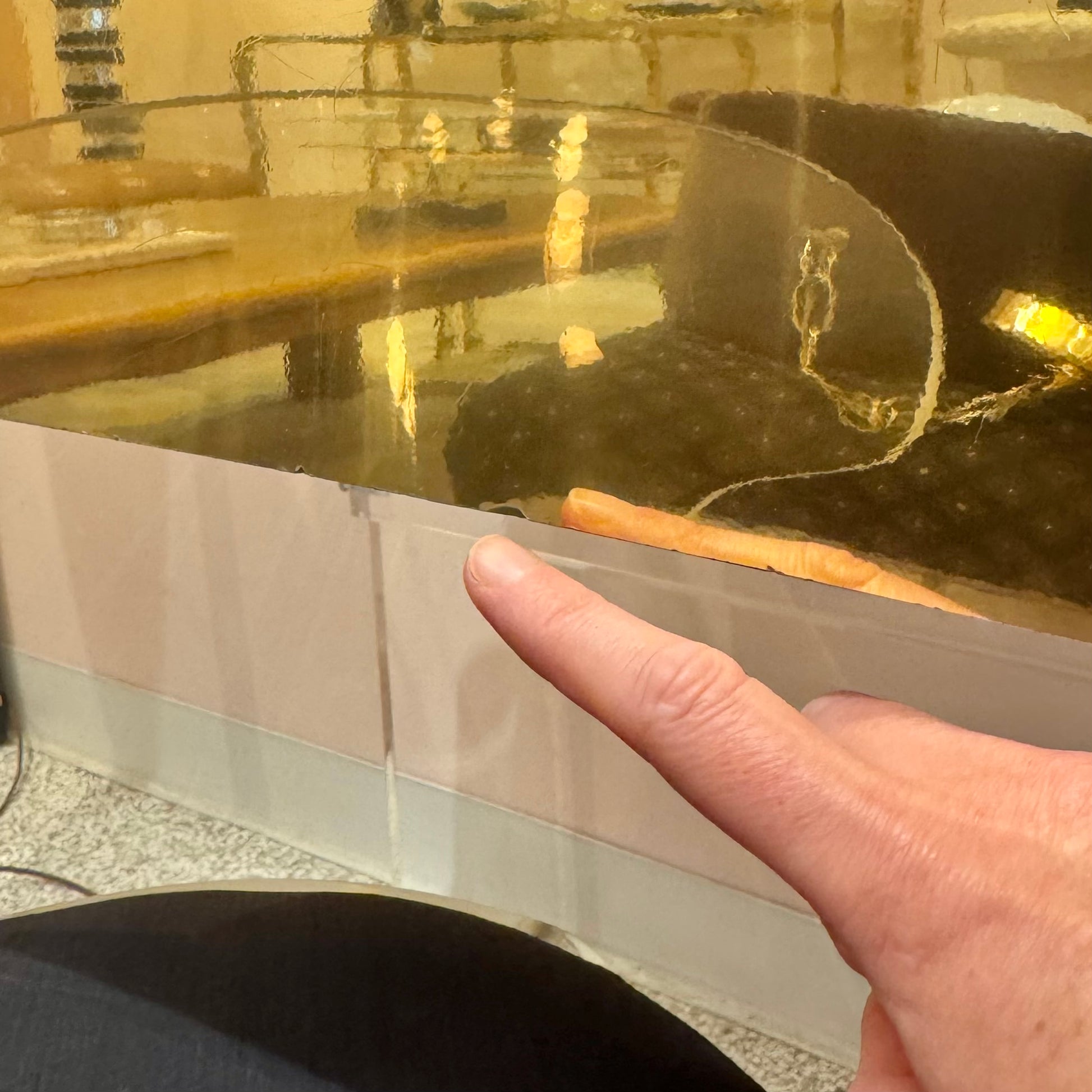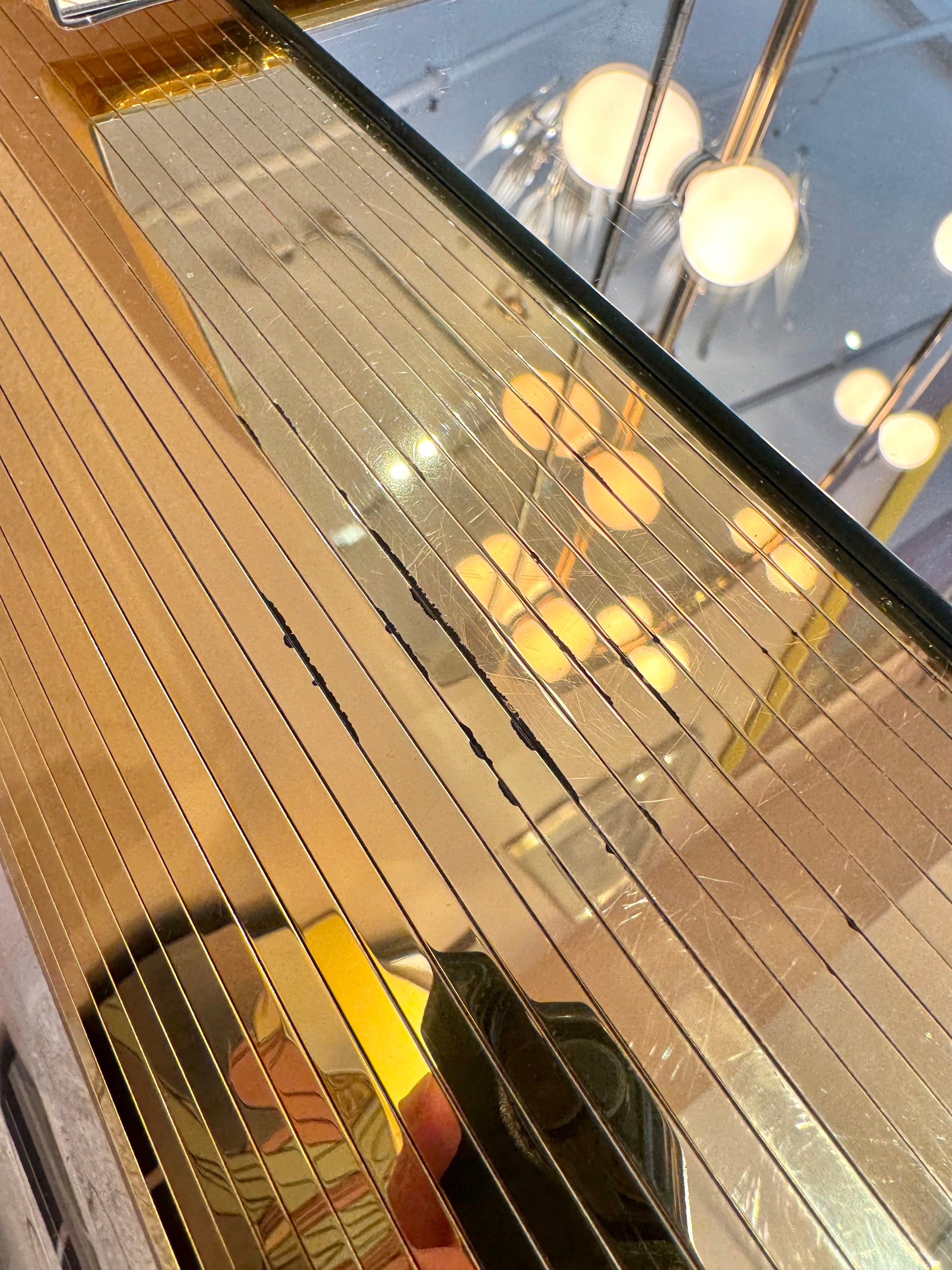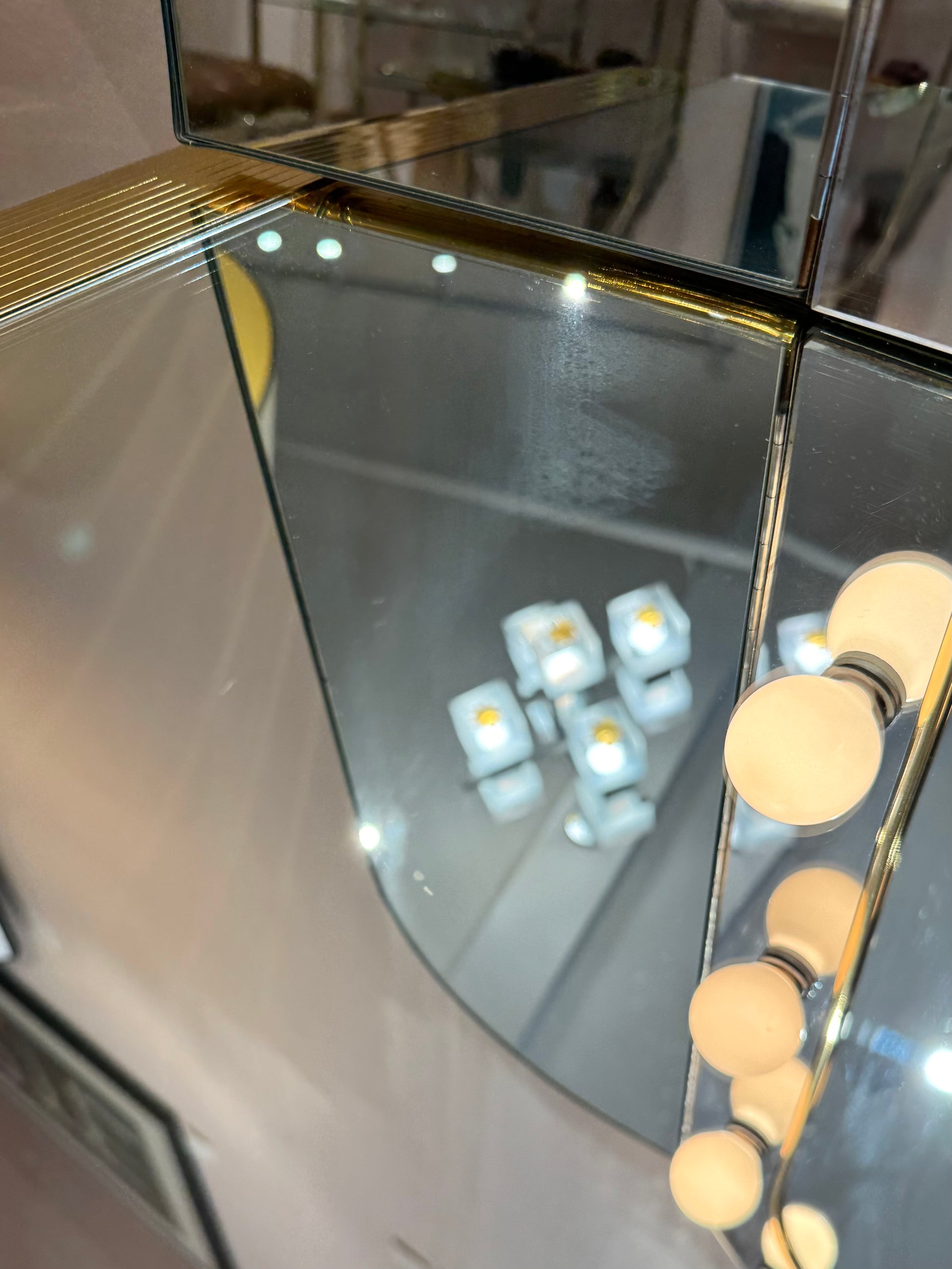 Condition: Very good vintage condition. Some faint cloudiness to mirrored top and minor areas of wear to gold fluting.
