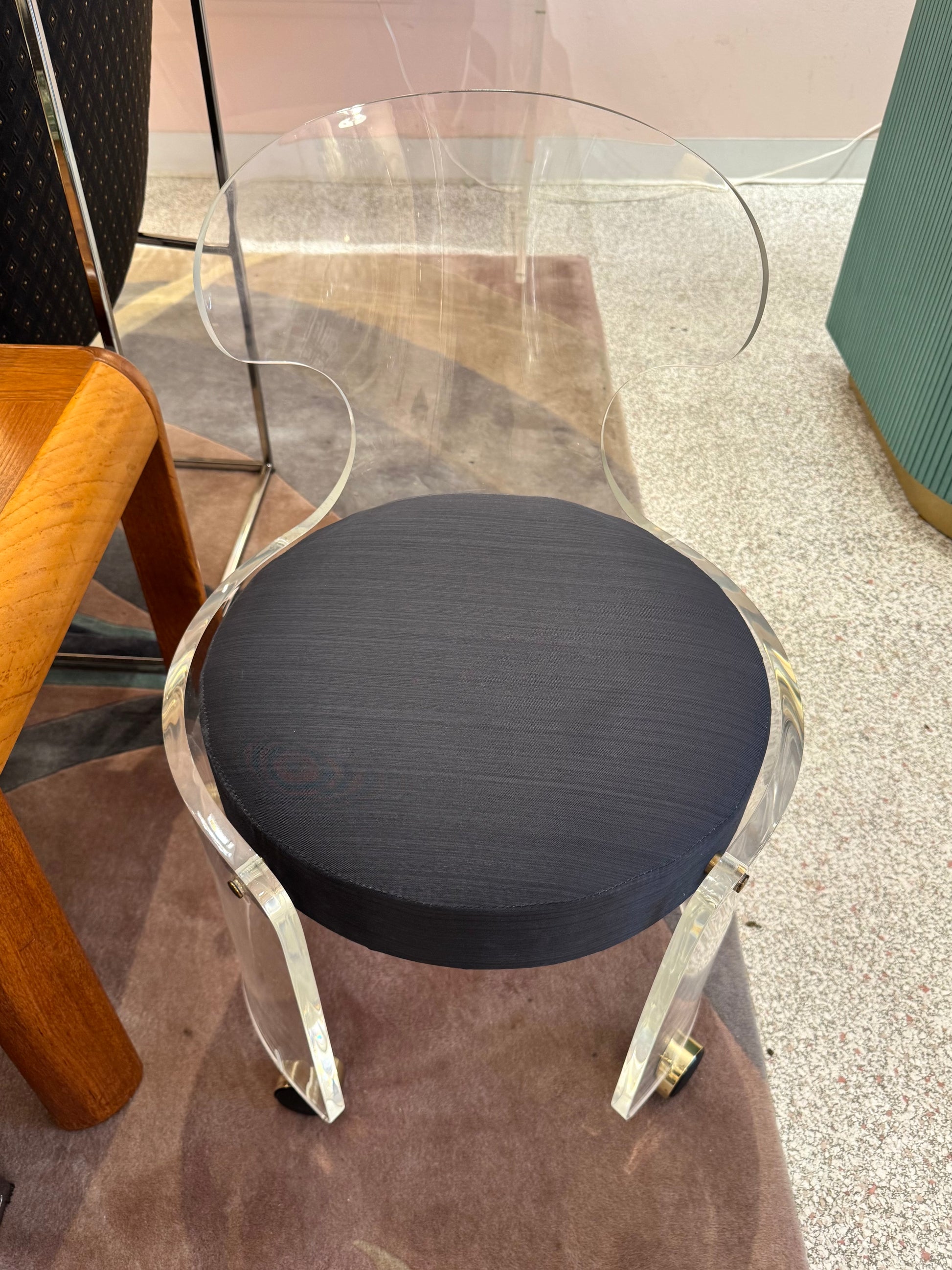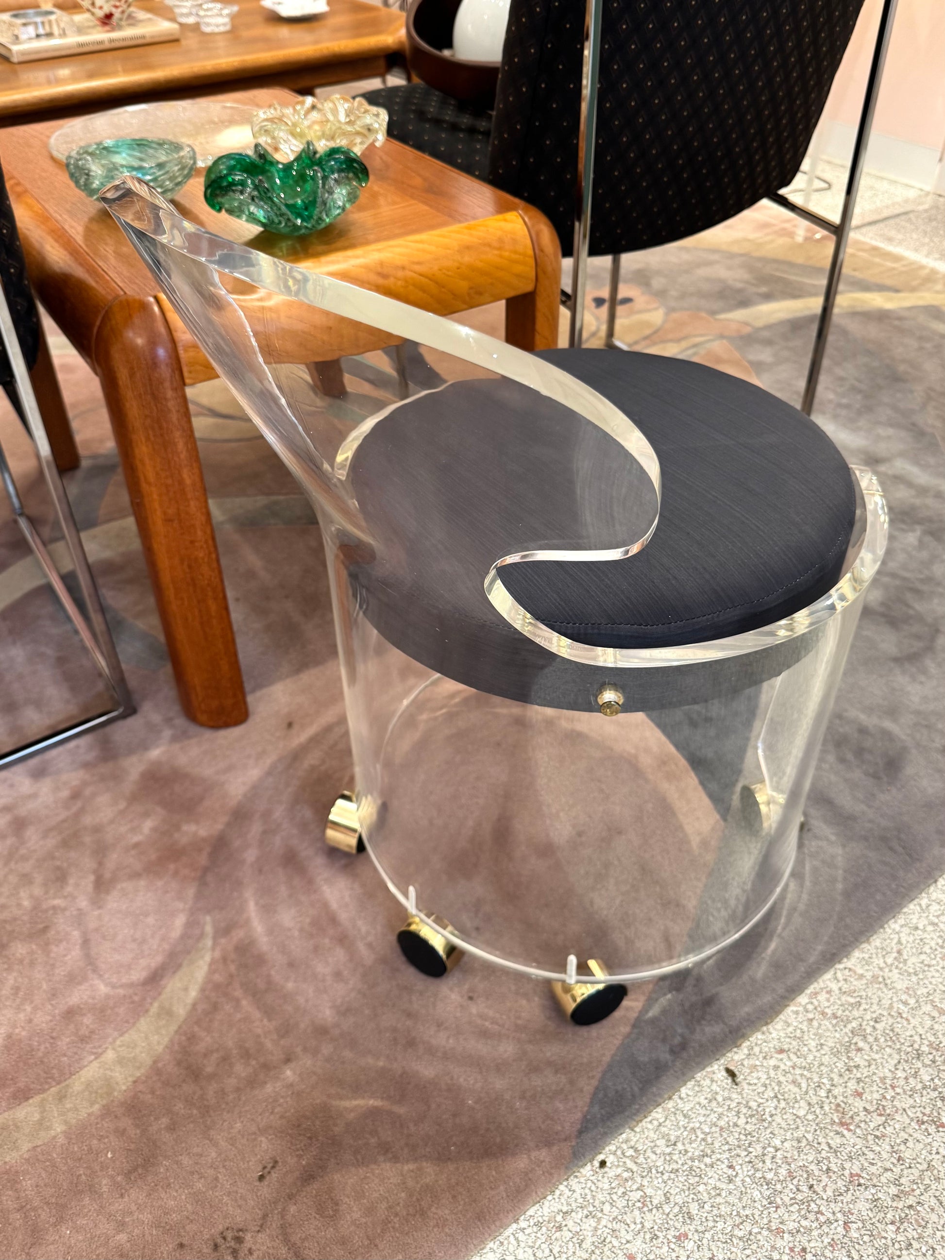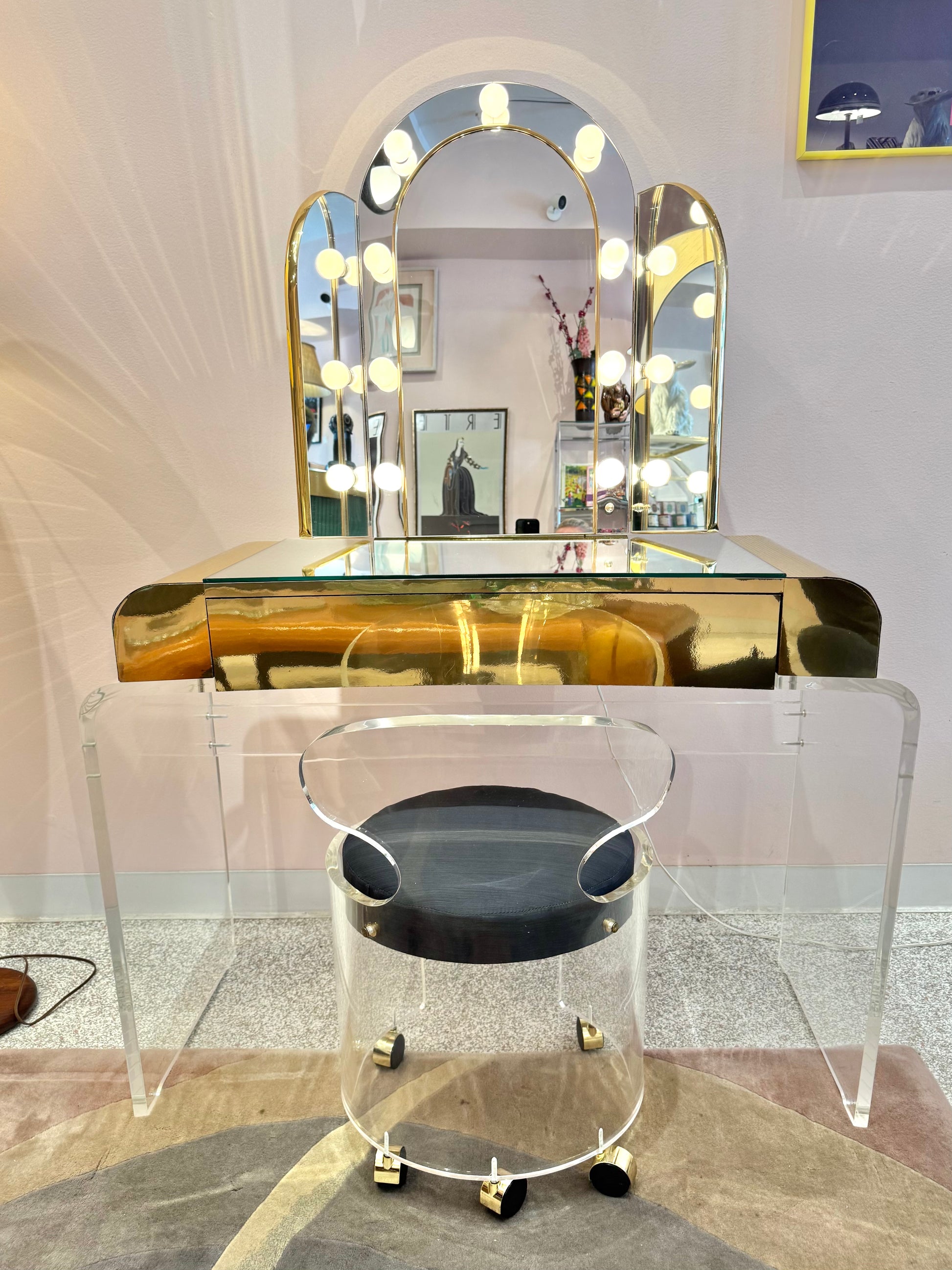 A spectacular lucite waterfall vanity with gold trim and adjustable light up mirror. Pull out drawer in front offers ample storage. Matching lucite stool is upholstered in original slate grey fabric. Cord wired for standard two prong US outlet. Light switch located bottom right of mirror as shown. Two spare bulbs included. C,1980's.