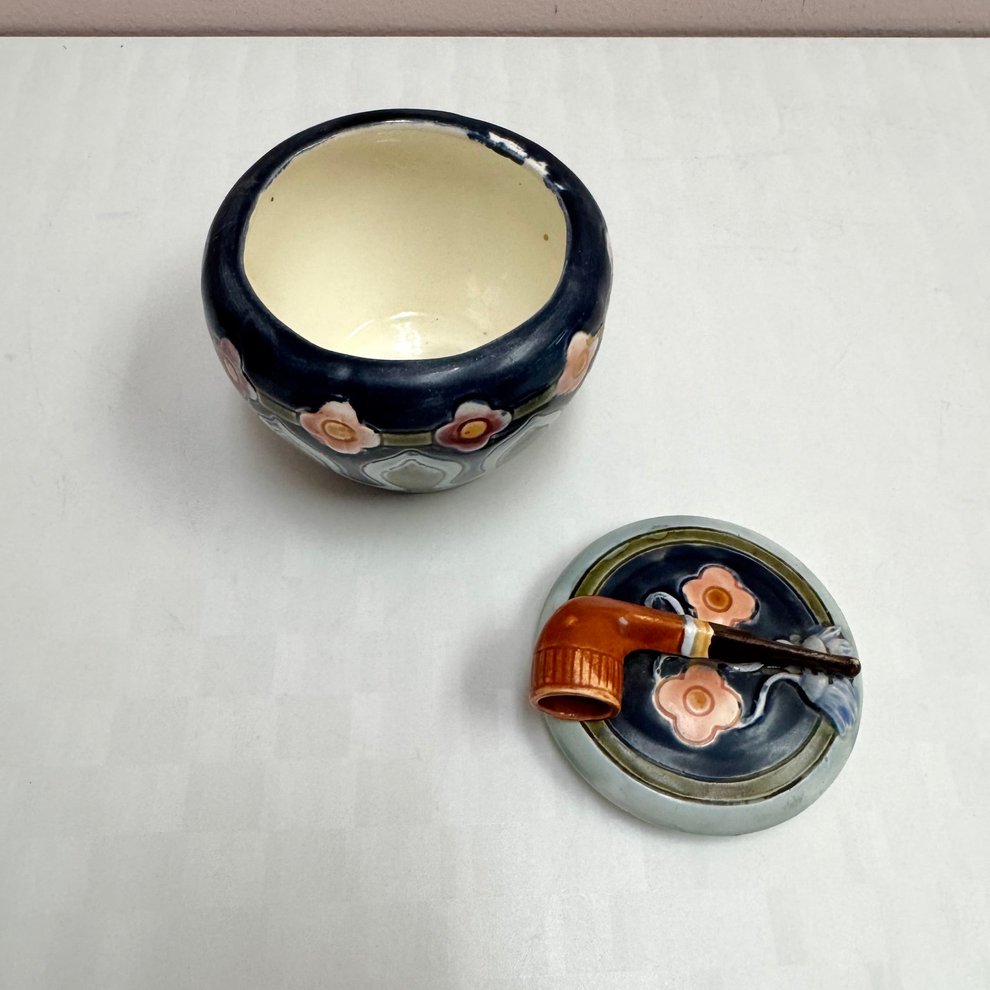 A beautiful antique hand painted majolica box with a three dimensional pipe on the lid. Dark navy blue, green and red design throughout. Circa late 19th early 20th century.