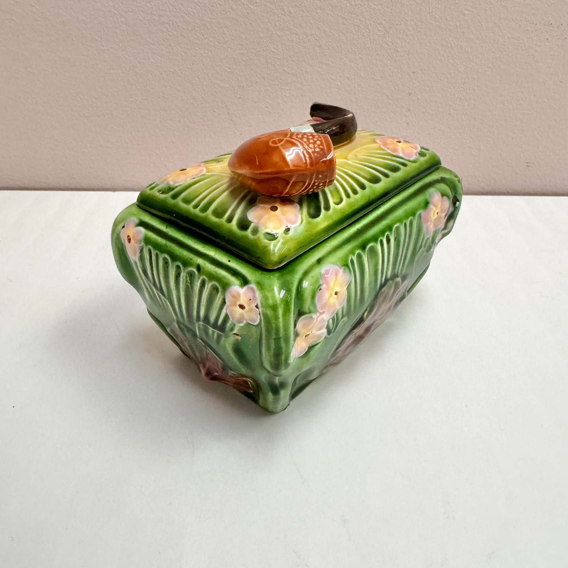 Antique Green Majolica Pipe Lidded Box