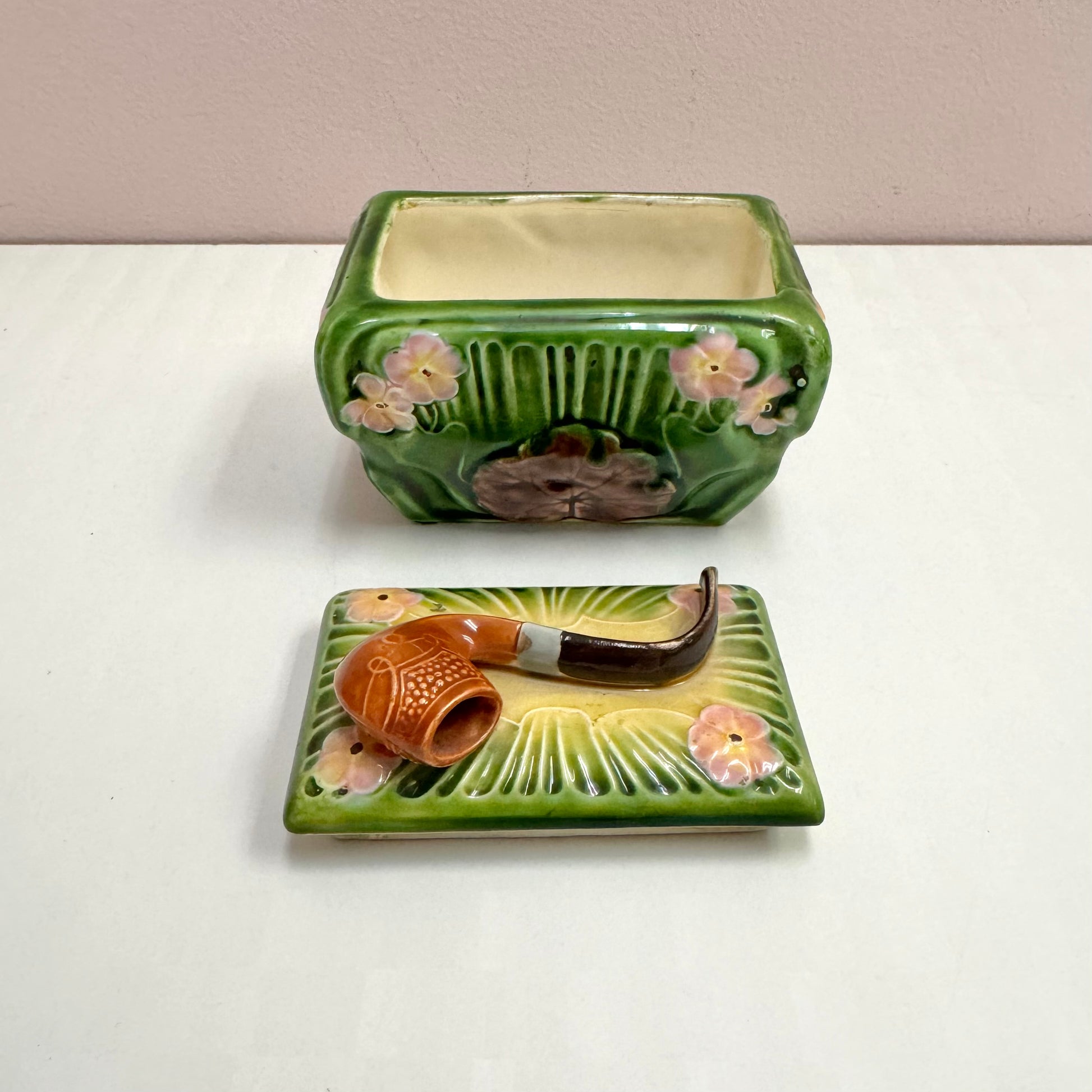 A beautiful antique hand painted majolica box with a three dimensional pipe on the lid. Tons of elegant green, yellow and pink art deco detailing throughout. Circa late 19th early 20th century.