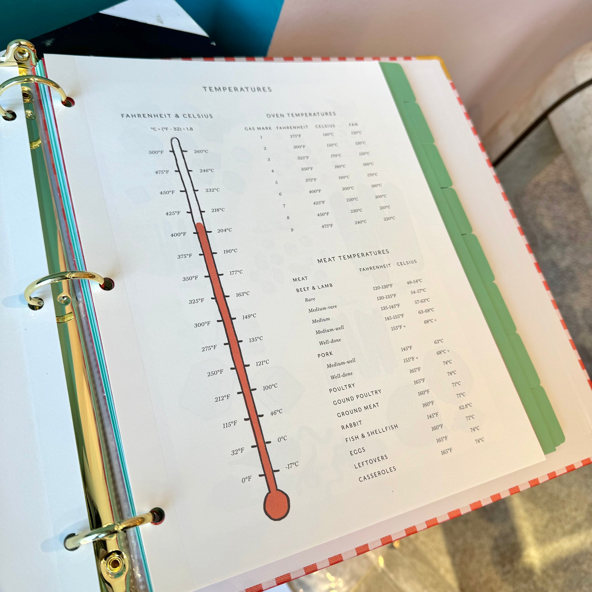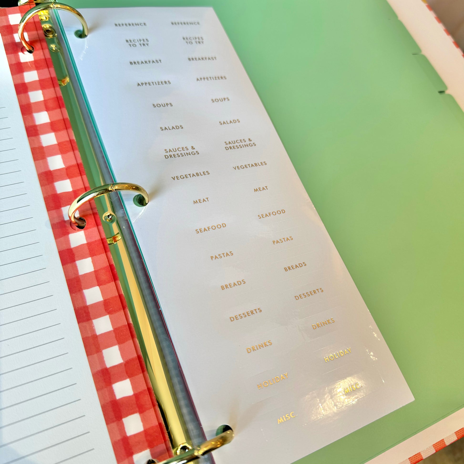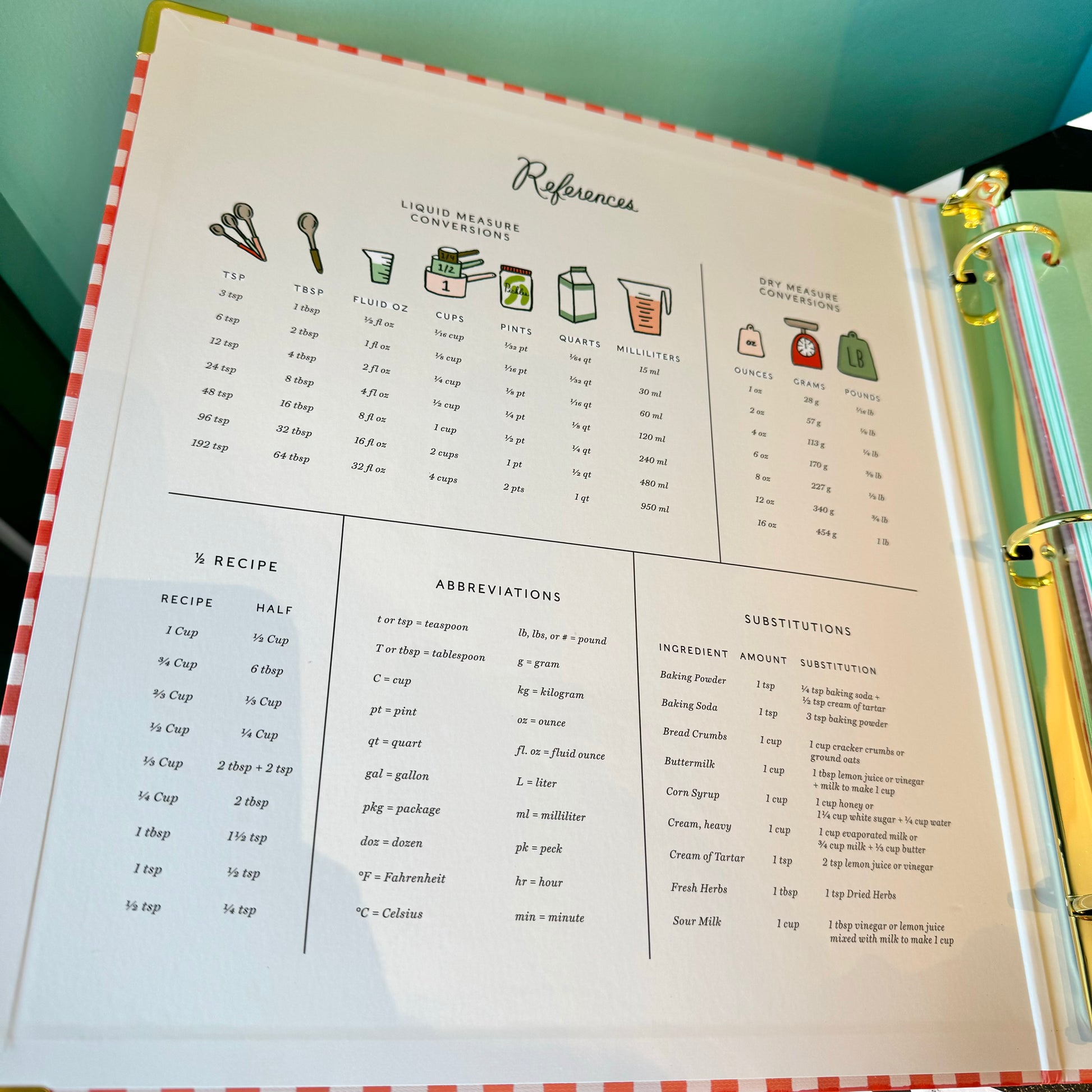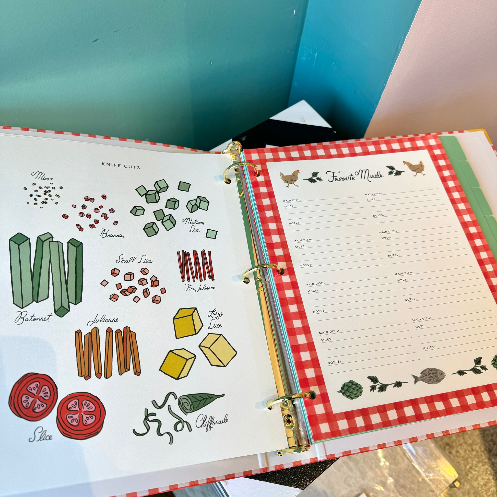 Illustrated cover with reinforced metal corners Printed in full color and foil stamped. Metallic gold foil. 10 clear recipe card sleeves. Three-ring mechanism. Double-sided pocket folder. 16 tabbed dividers. Adhesive labels. Reference pages & illustrations.