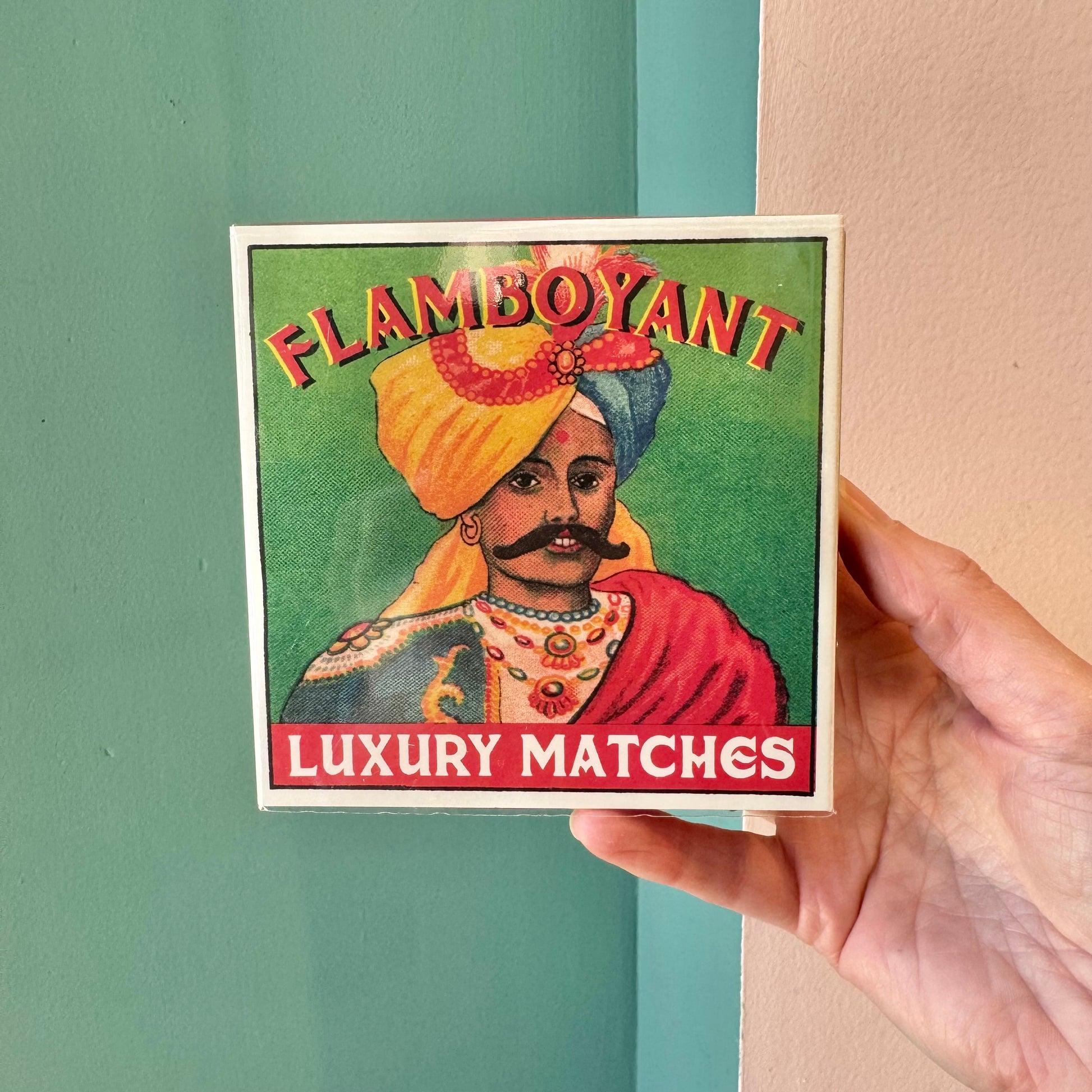 A gorgeous box of luxury matches, featuring a Flamboyant mustachioed man on the box and approx 125 long matches, by Archivist Gallery. Made in United Kingdom.