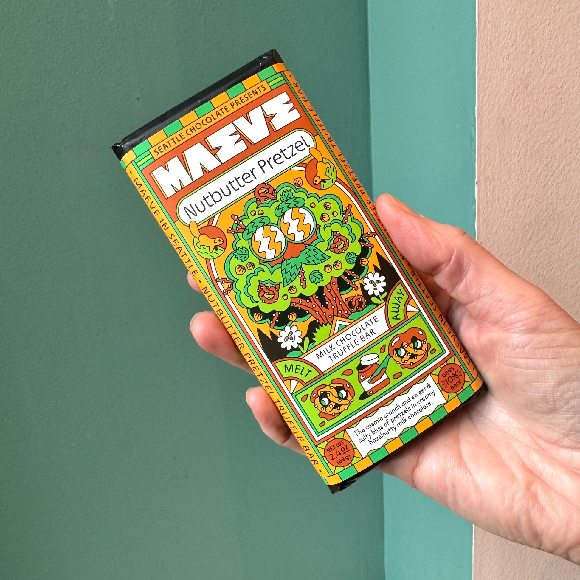 Milk chocolate with creamy hazelnut butter, salty and crunchy pretzel pieces.