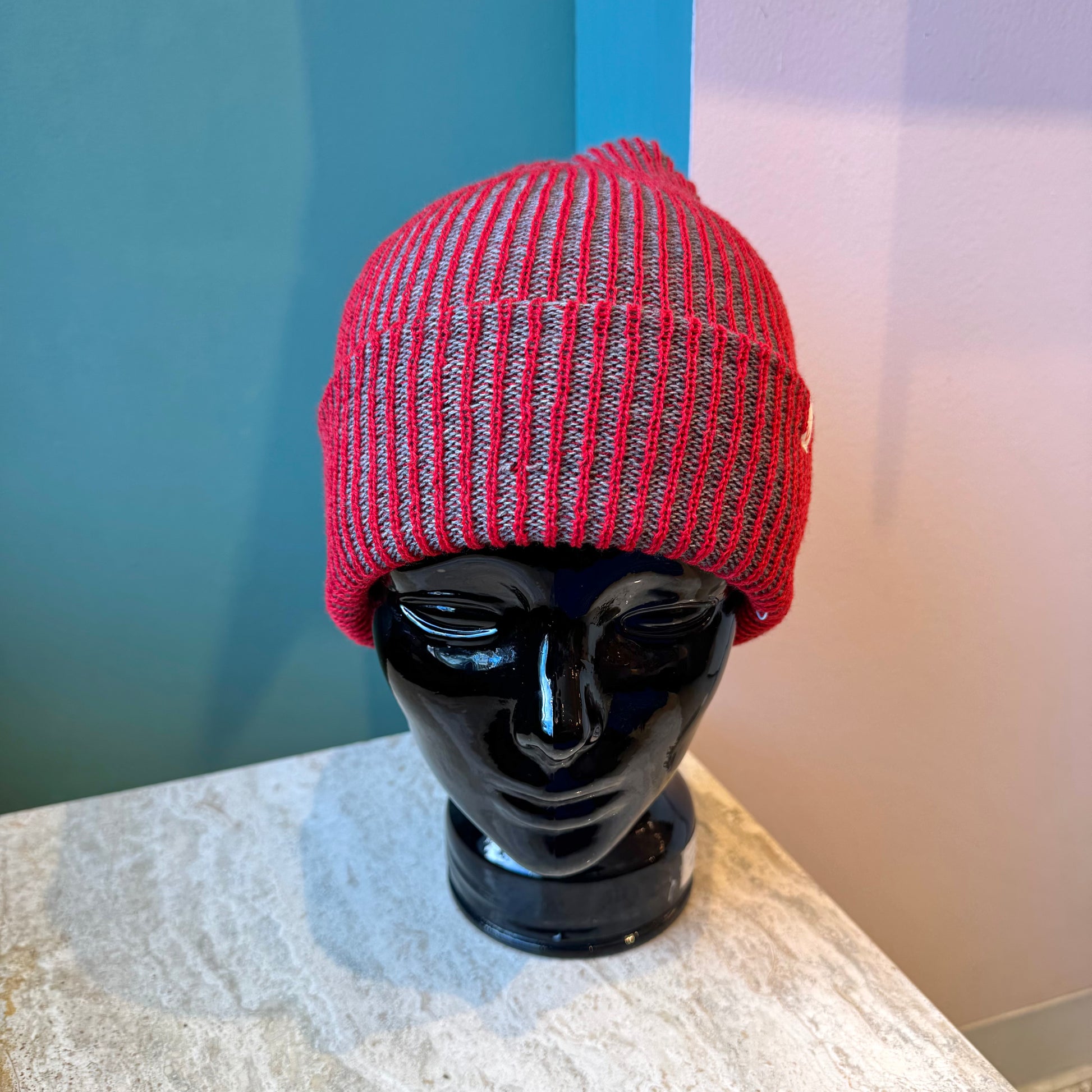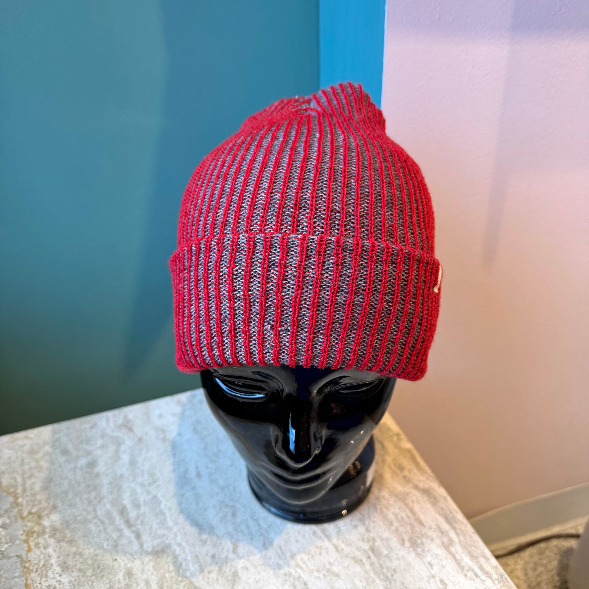 Simple Rib Knit Beanie: Red Grey