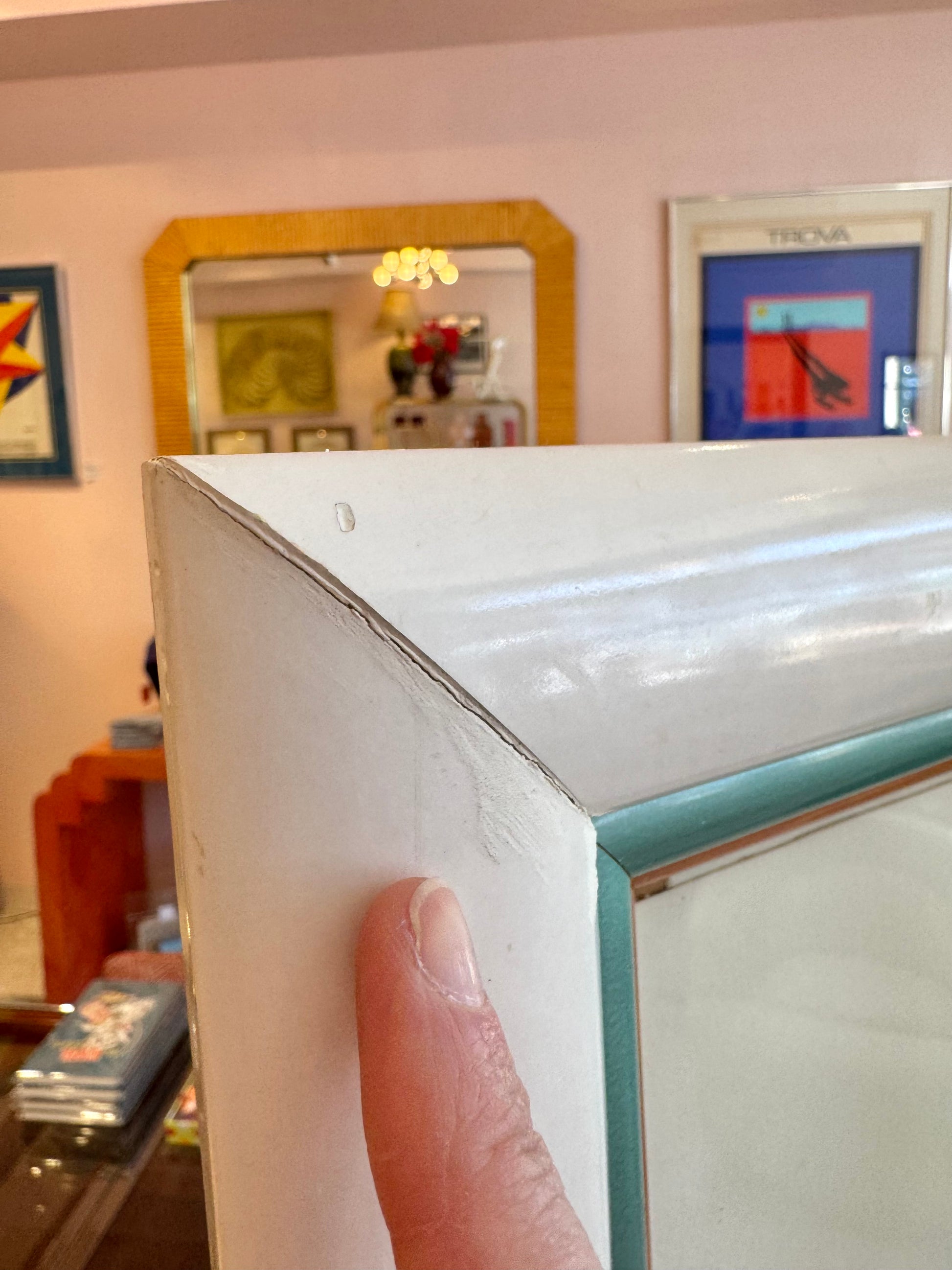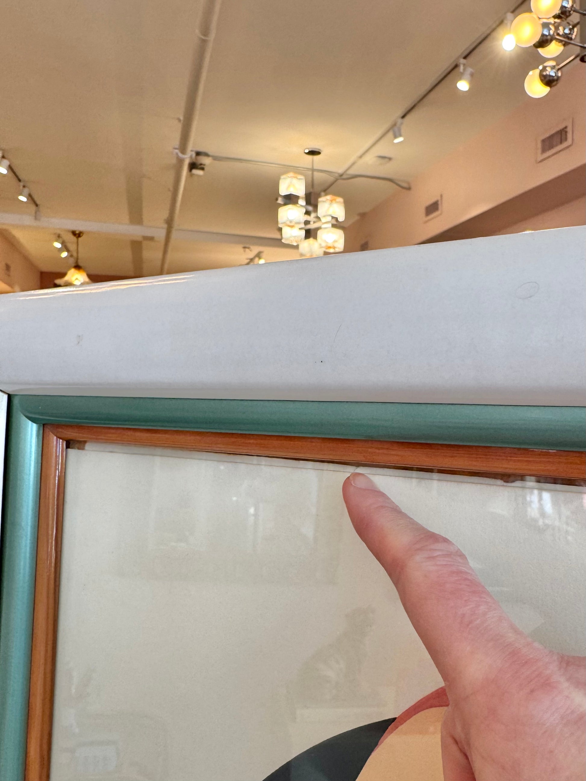 Condition: The print has slipped down approximately .3 of an inch in the frame. Some slight rippling to print, most evident at bottom as shown. Some signs of wear to frame - see pics.