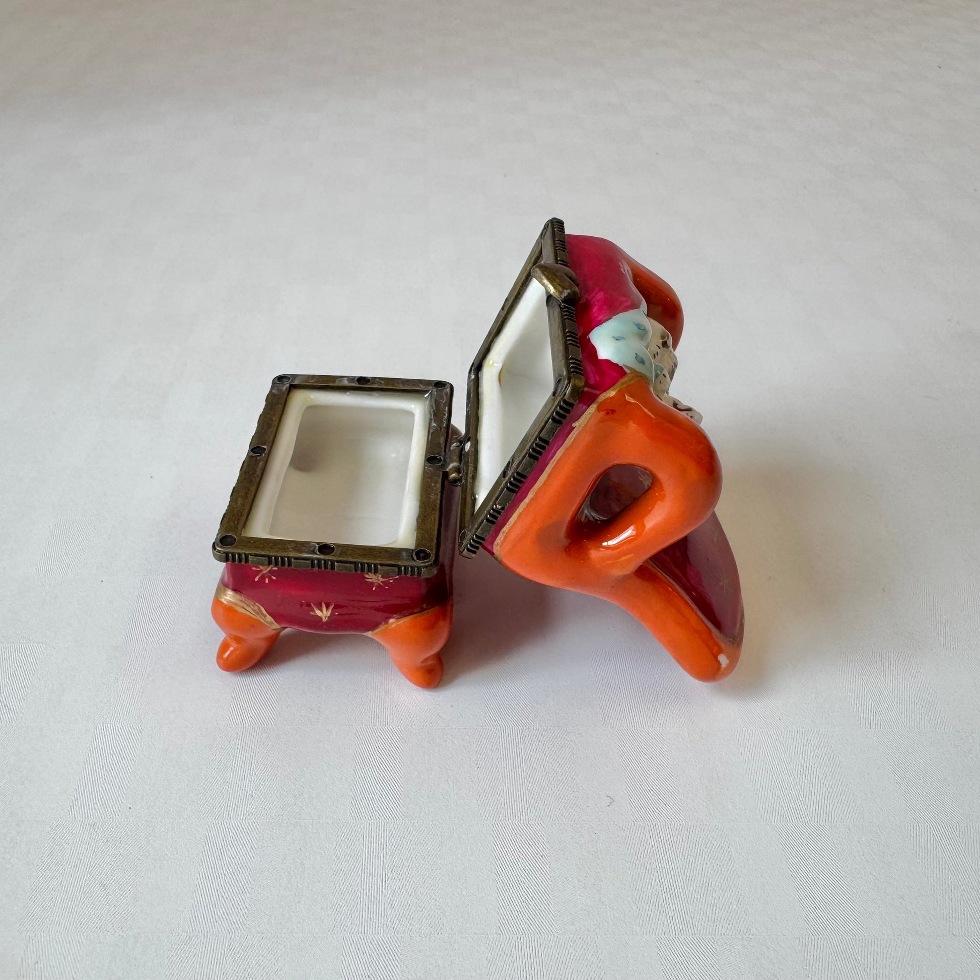 A wonderfully charming vintage cat in a plush arm chair trinket box with metal closure.