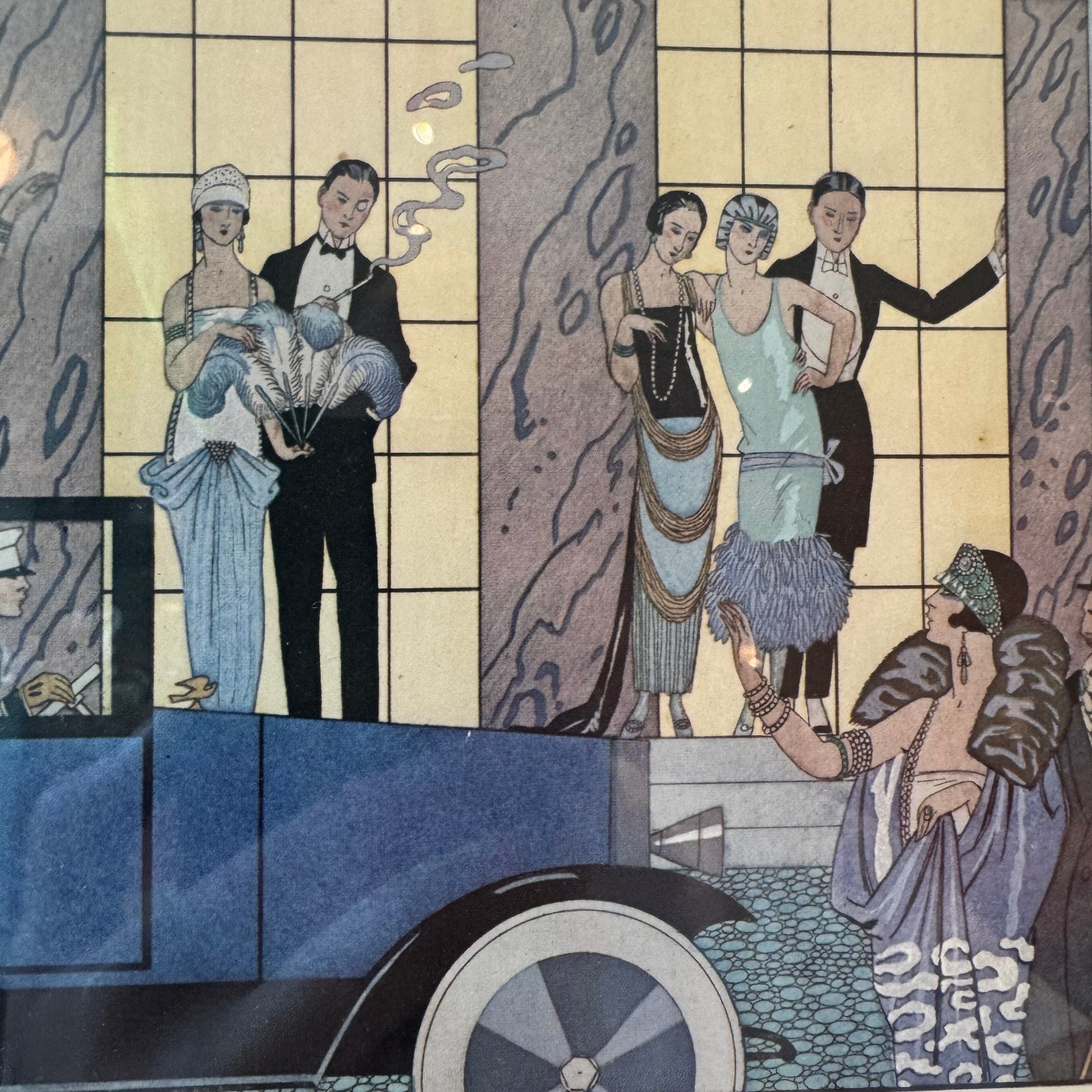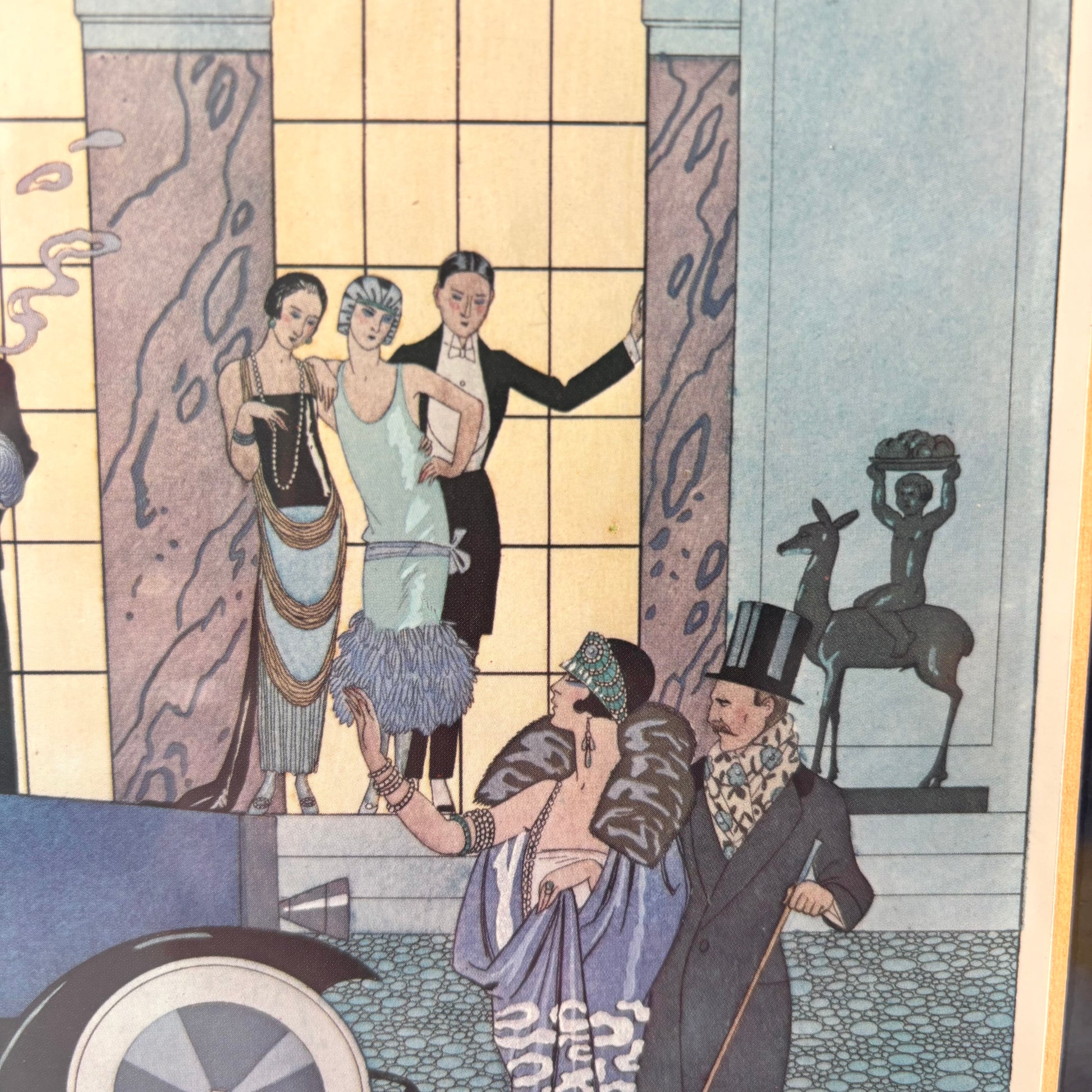 A wonderful vintage framed print of the Art Deco era artwork "Au Revoir", by artist George Barbier. The artwork depicts a scene of a high-society farewell, with a group of elegantly dressed party guests saying goodbye to one another. In a metal frame.