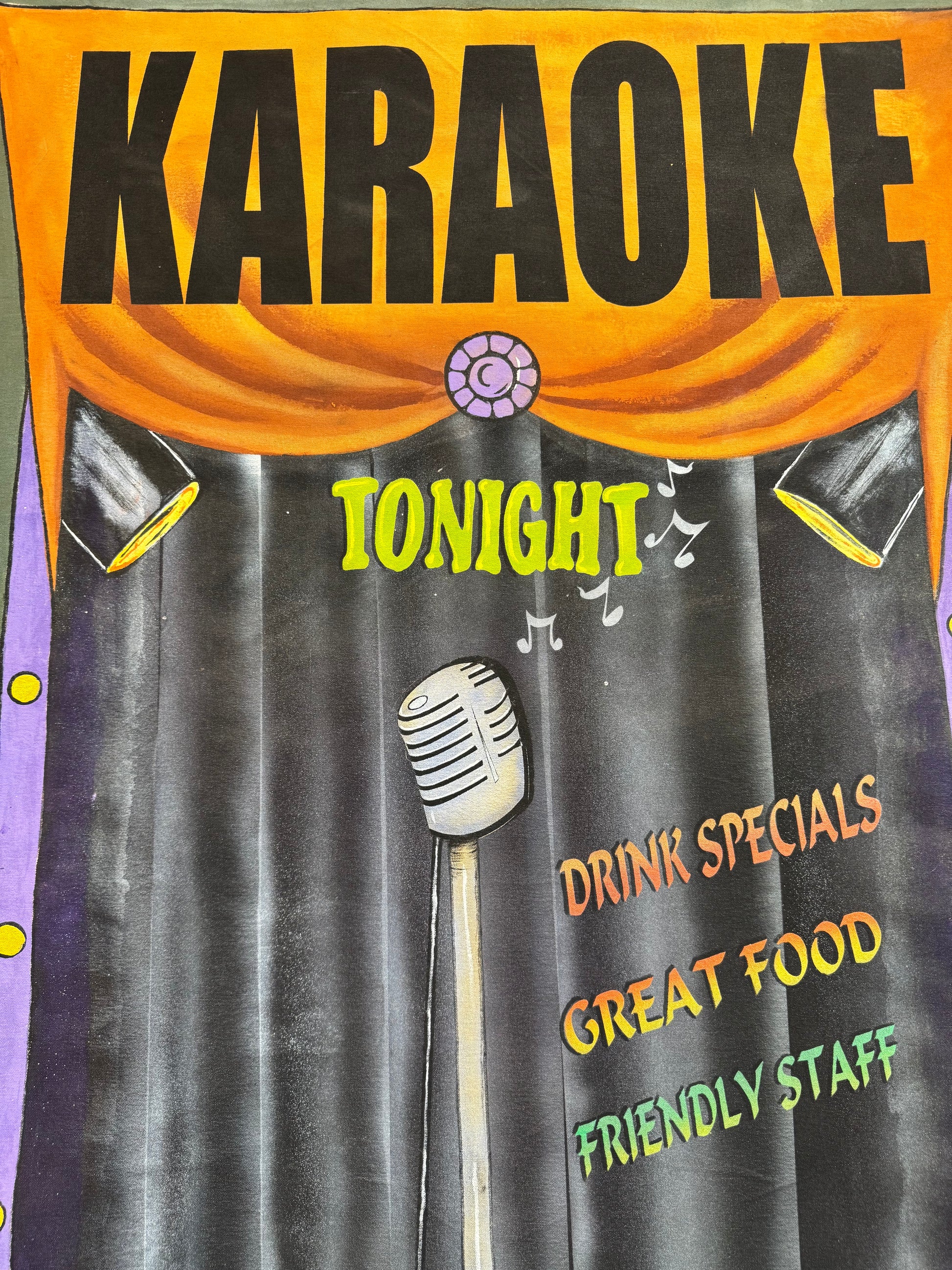 A fantastically whimsical large vintage hand painted artwork, featuring a karaoke stage with microphone, curtain and lights. A wonderful piece with so much vintage charm. Canvas with wooden rods at top and bottom and cord for easy hanging. C.1990's.