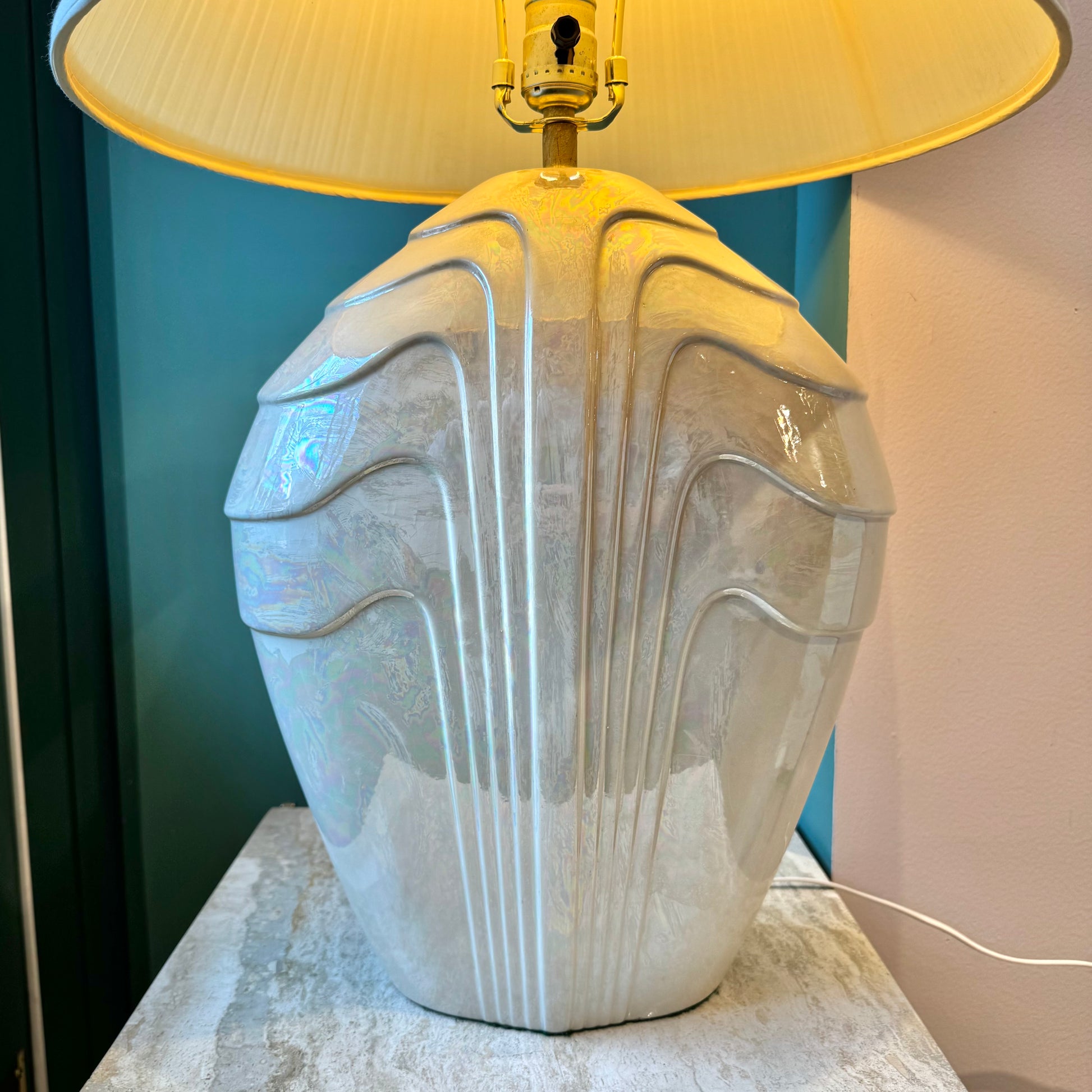 A beautiful large cream colored opalescent ceramic lamp with brass trim detailing. A gorgeous piece with so much vintage Hollywood Regency style character. C.1980's. Shade pictured included for no additional charge.