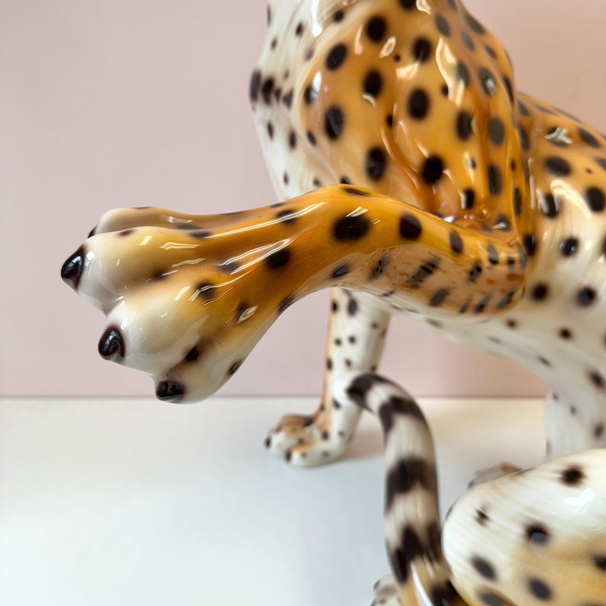 A spectacular large porcelain ceramic cheetah statue. Made in Italy, stamped on base. Rare in this exceptional condition and size. Circa 1960/70's.