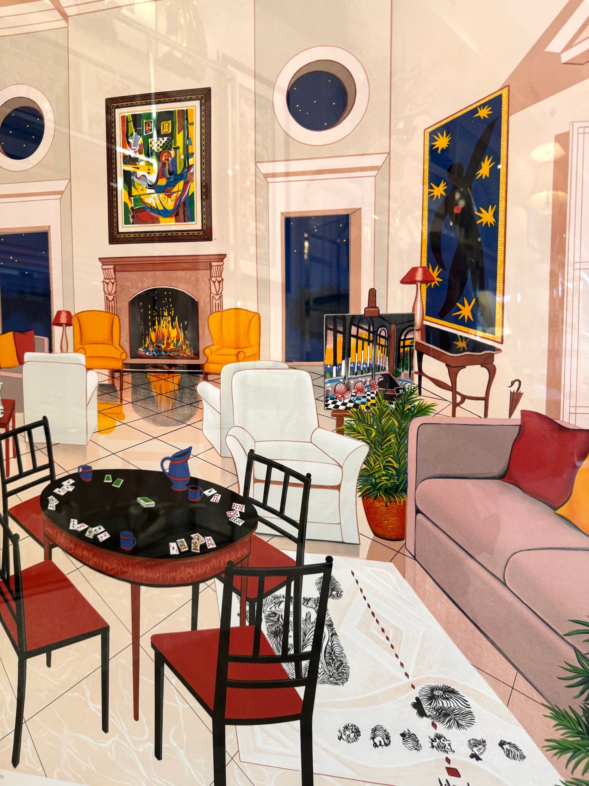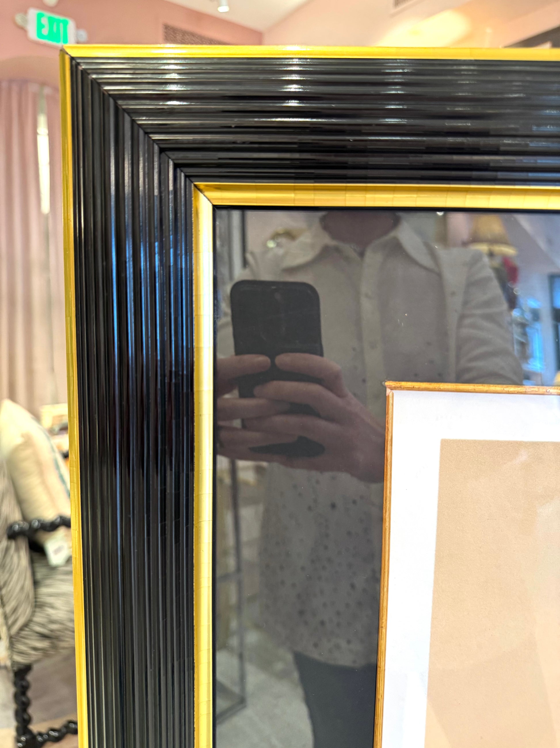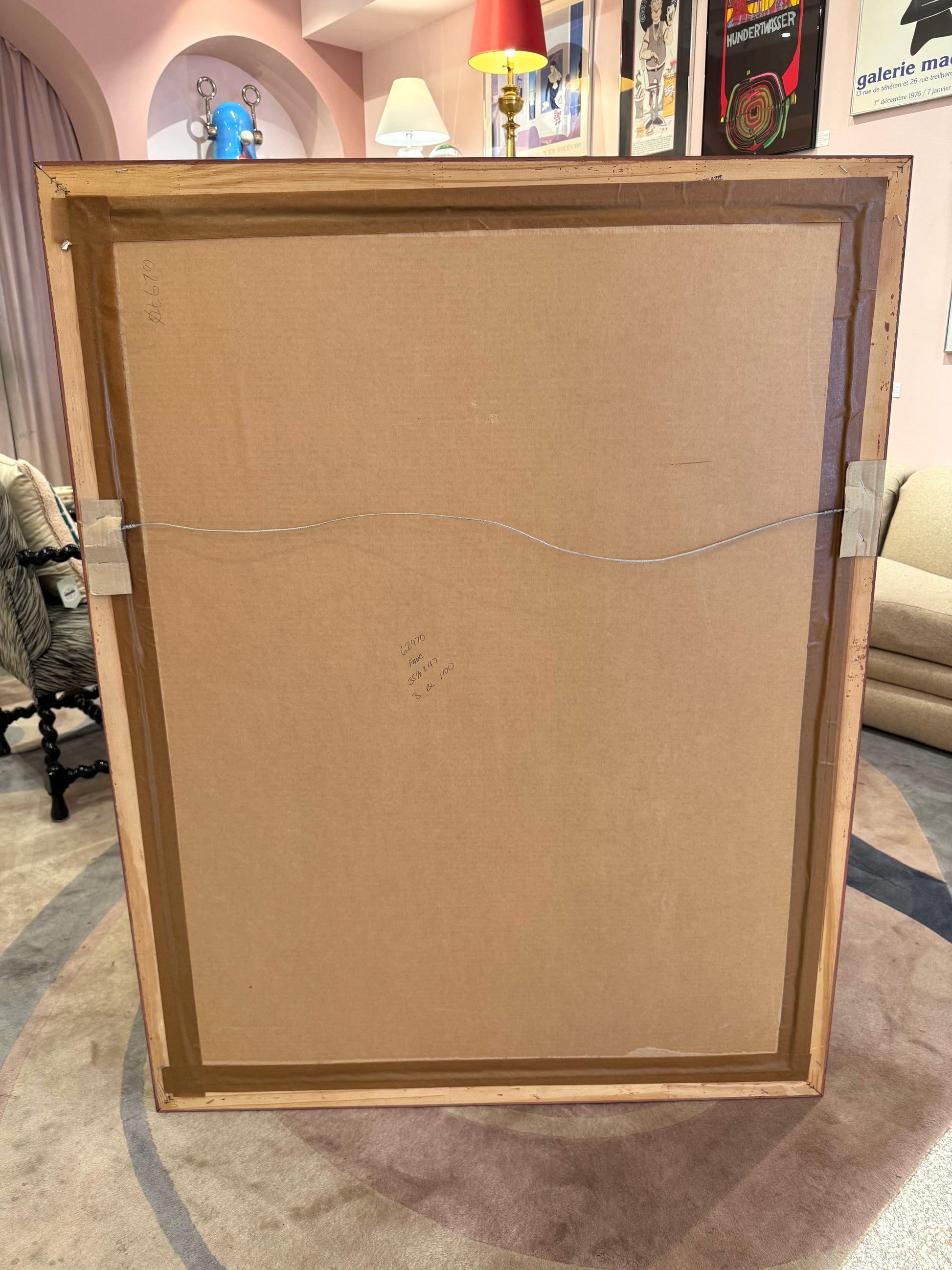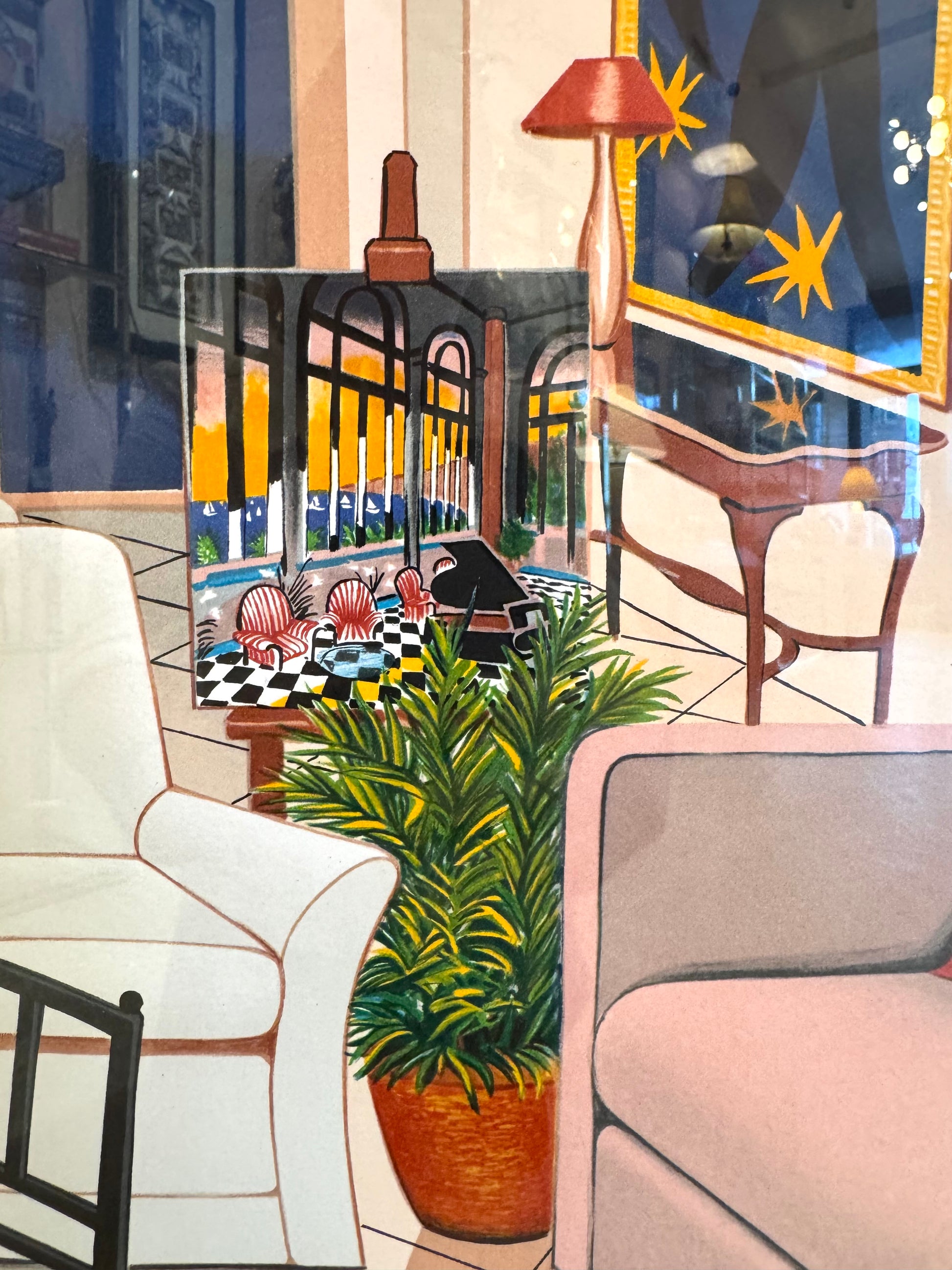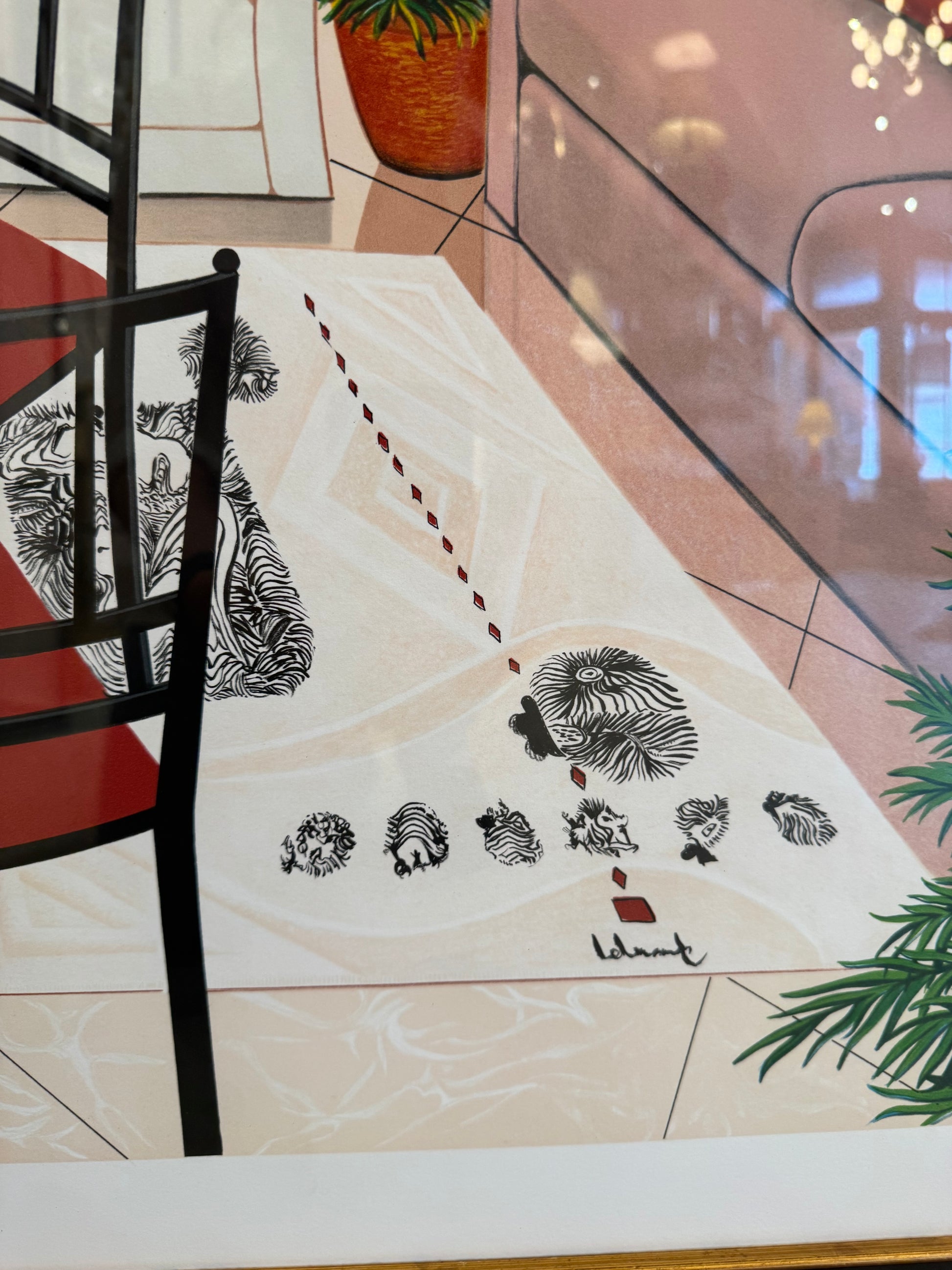 A large, commanding piece with so many wonderful details, in a black and gold stepped lacquer frame with black and gold mat. The piece depicts a large salon or lounge, with a card table in the foreground, a roaring fire flanked by large windows in the background, Matisse's "Icarus" hangs on the right wall and Ledan's own piece "Interior with Max" rests on an easel peeking out from behind a fern. The piece is signed and numbered in pencil, #13/350. Original Certificate of Authenticity from Park West Gallery included. C.1993.