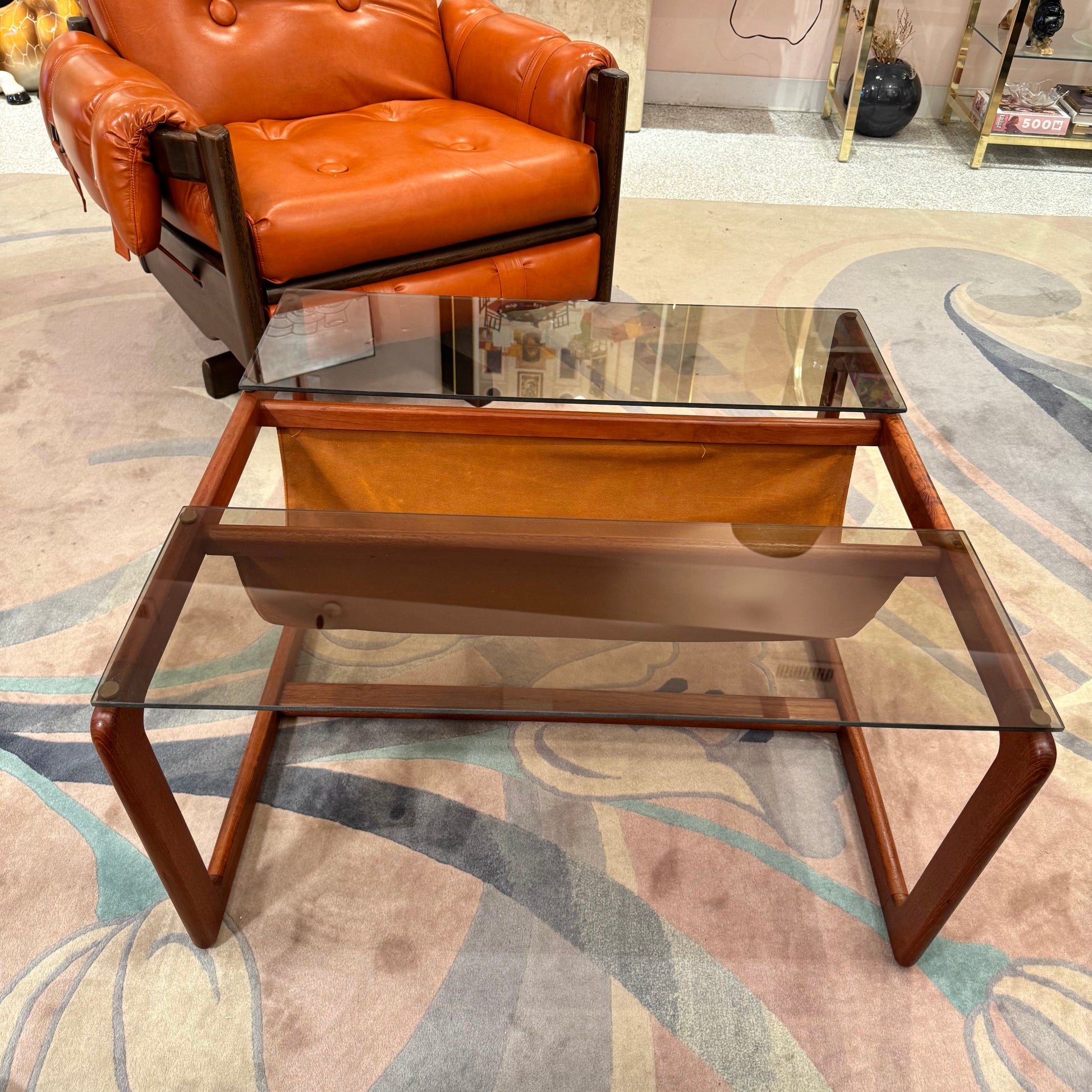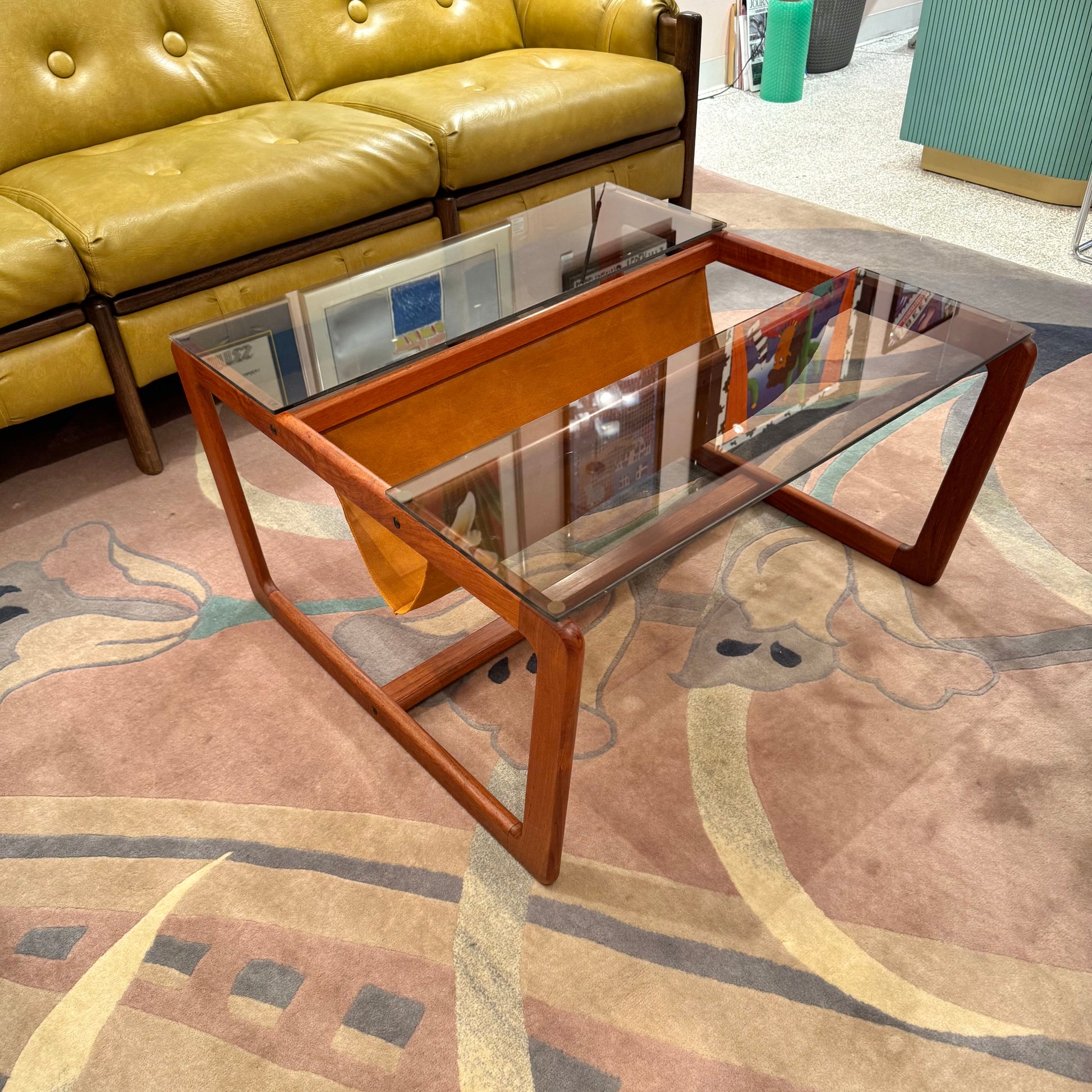 An elegantly sculpted teak coffee table with smoked glass top and cognac colored suede magazine sling. The frame is beautifully hand crafted with smooth sleek lines. The magazine sling is both functional and aesthetically pleasing. C.1970's.