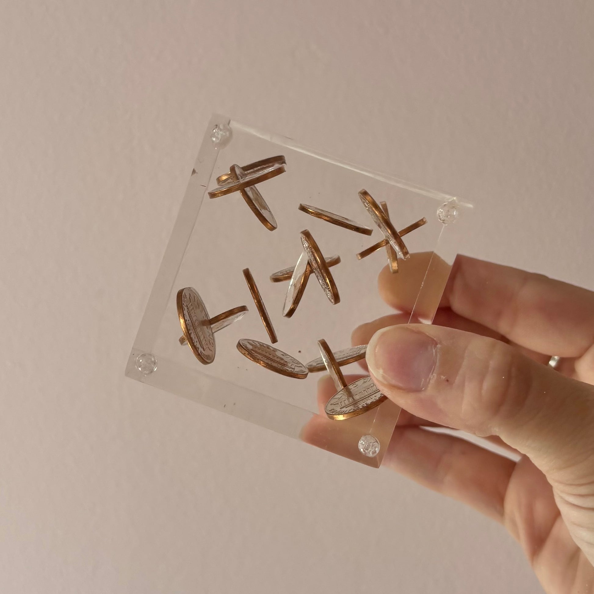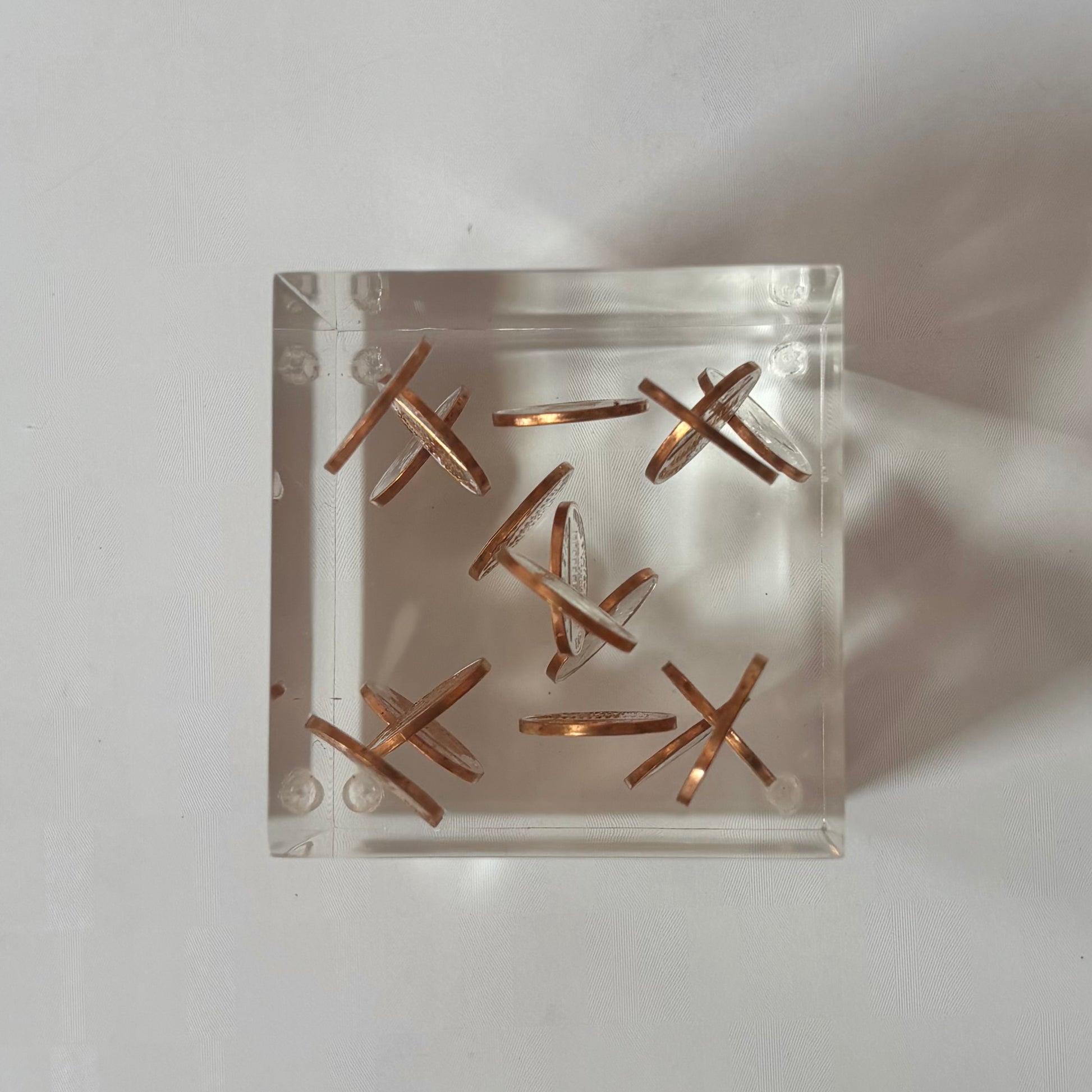 A sleek vintage lucite paperweight encased with 1969 pennies.