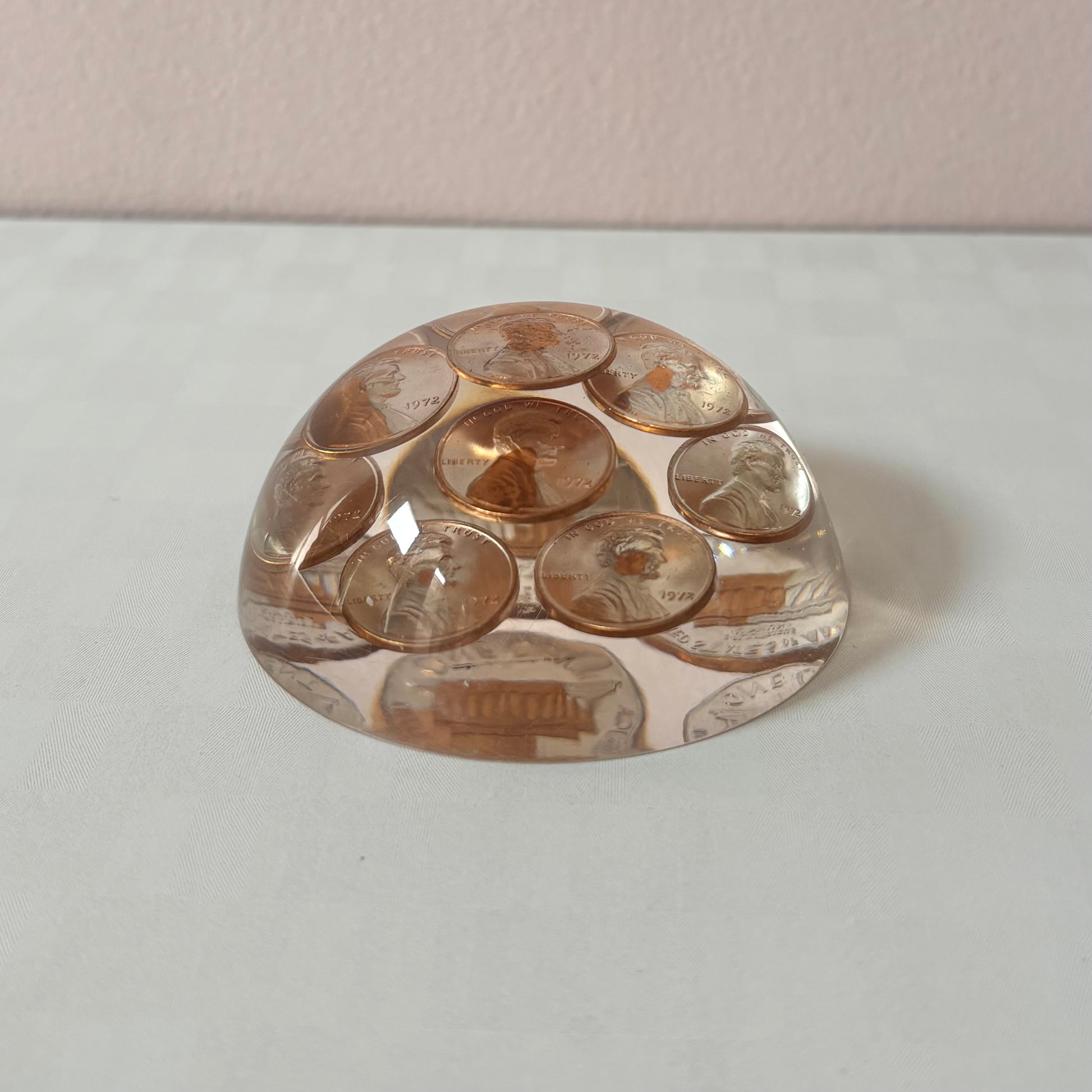 Fantastic dome shaped lucite paperweight encased with 1972 pennies.