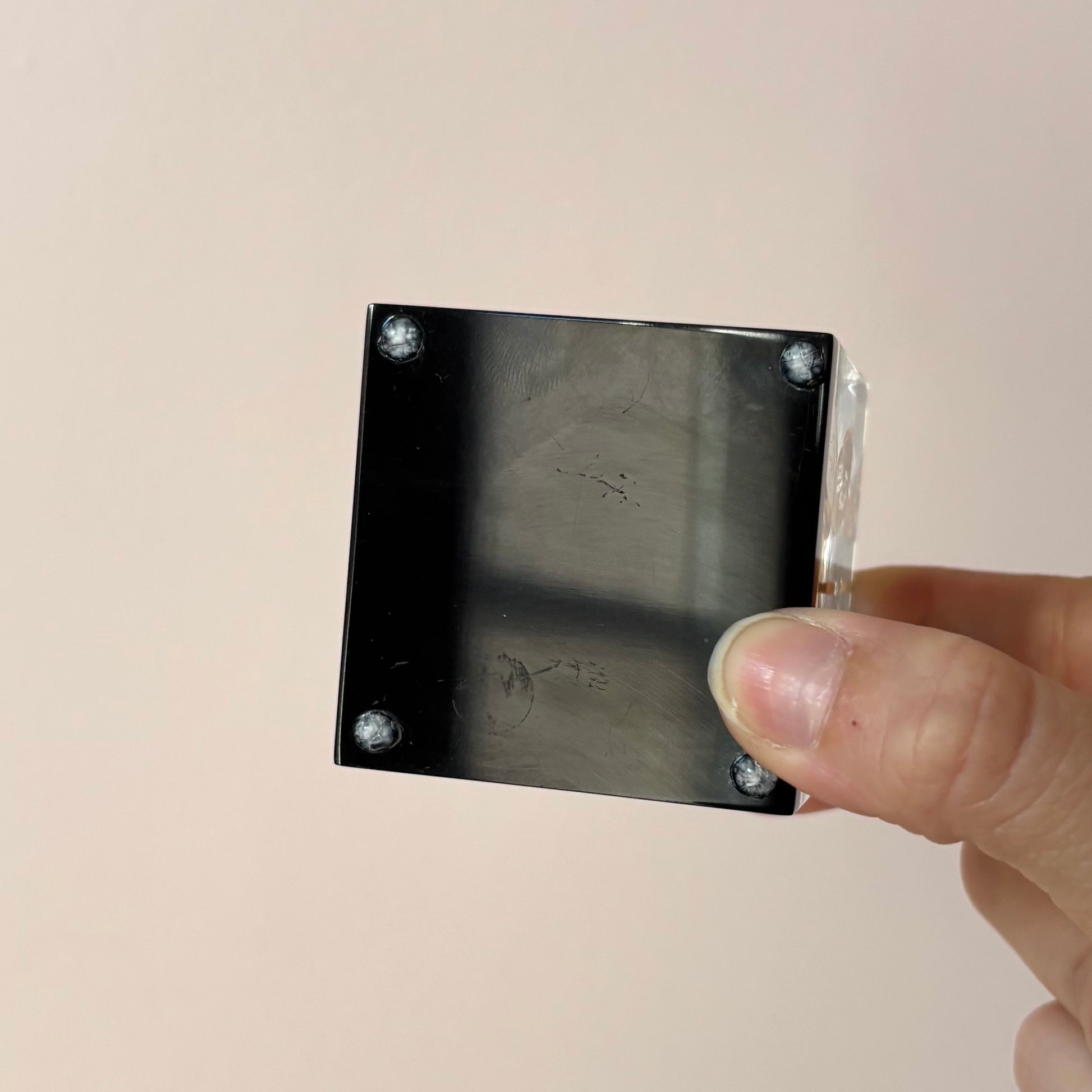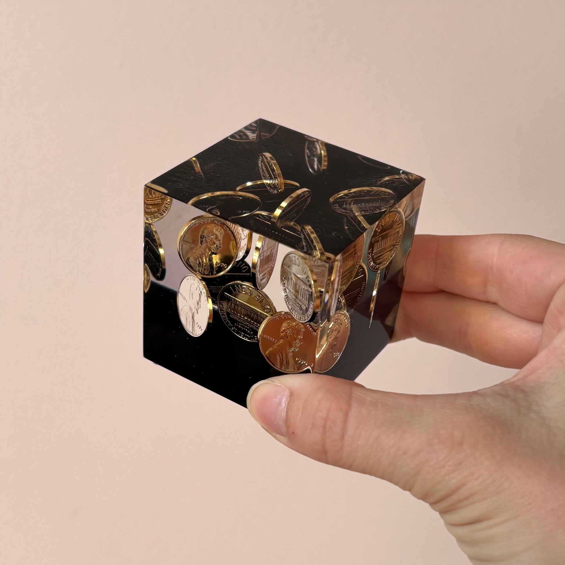 Fantastic clear lucite 1970 penny paperweight with a black base.