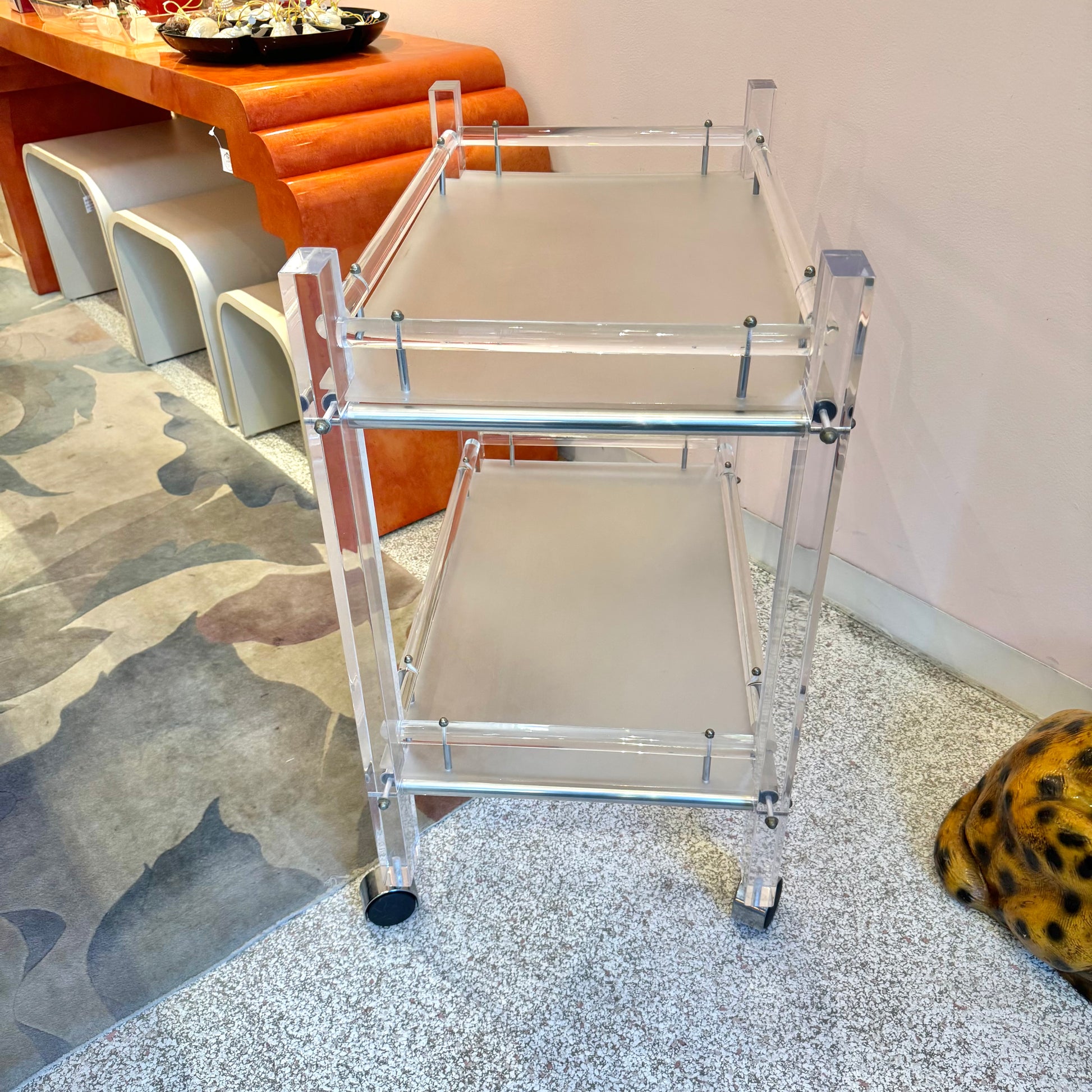 A stunning vintage lucite and stainless steel bar cart with caster wheels and two removable tray shelves, in the style of Charles Hollis Jones. The lucite is clear and bright and the wheels roll smoothly. Each removable shelf has lucite handles and a frosted lucite tray. C.1980's.