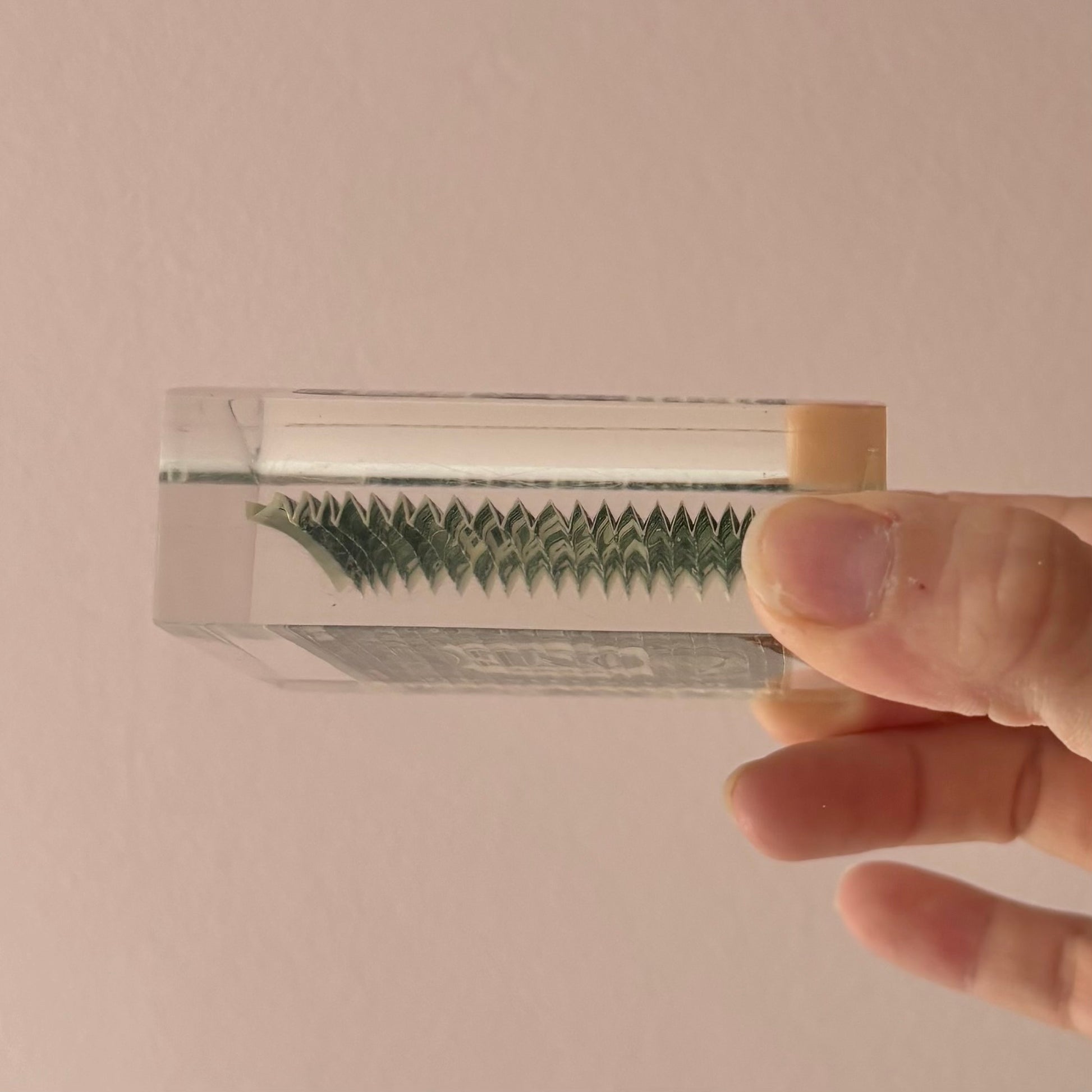 A fantastic accordion folded one dollar bill encased in lucite. C.1970's.