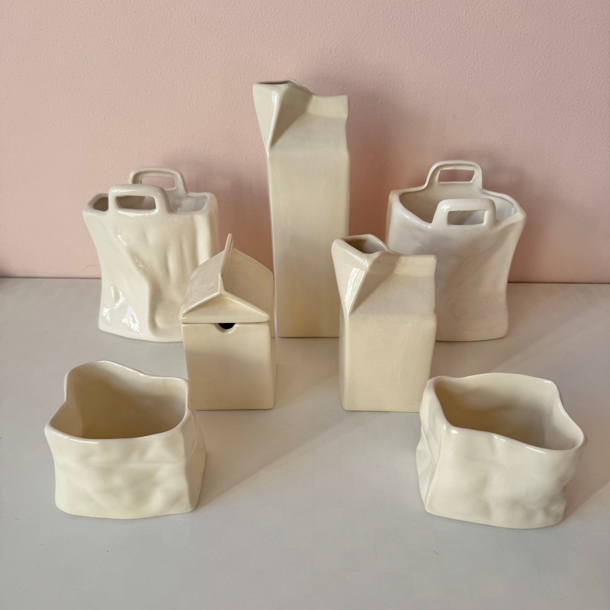 A charming pair of ceramic "paper bag" containers, signed Carol, dated 1987. Perfect for holding toiletries. See our other listings for the matching pieces, each sold separately.
