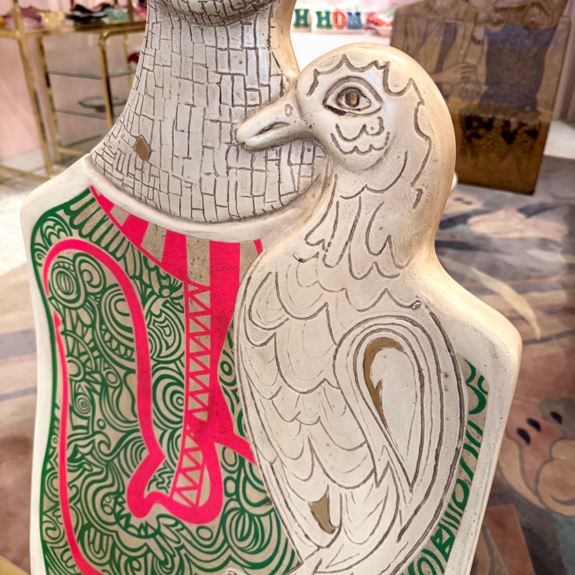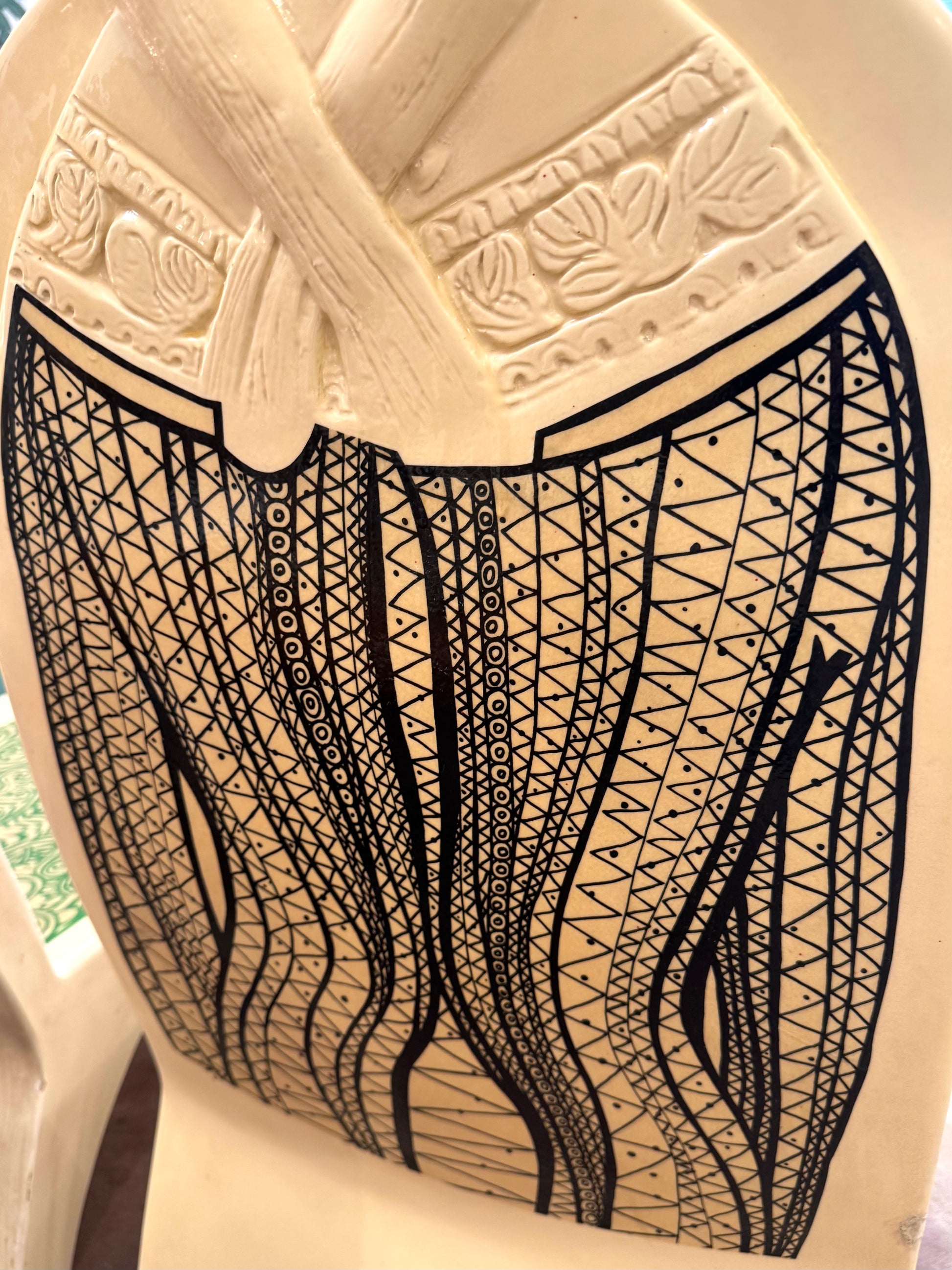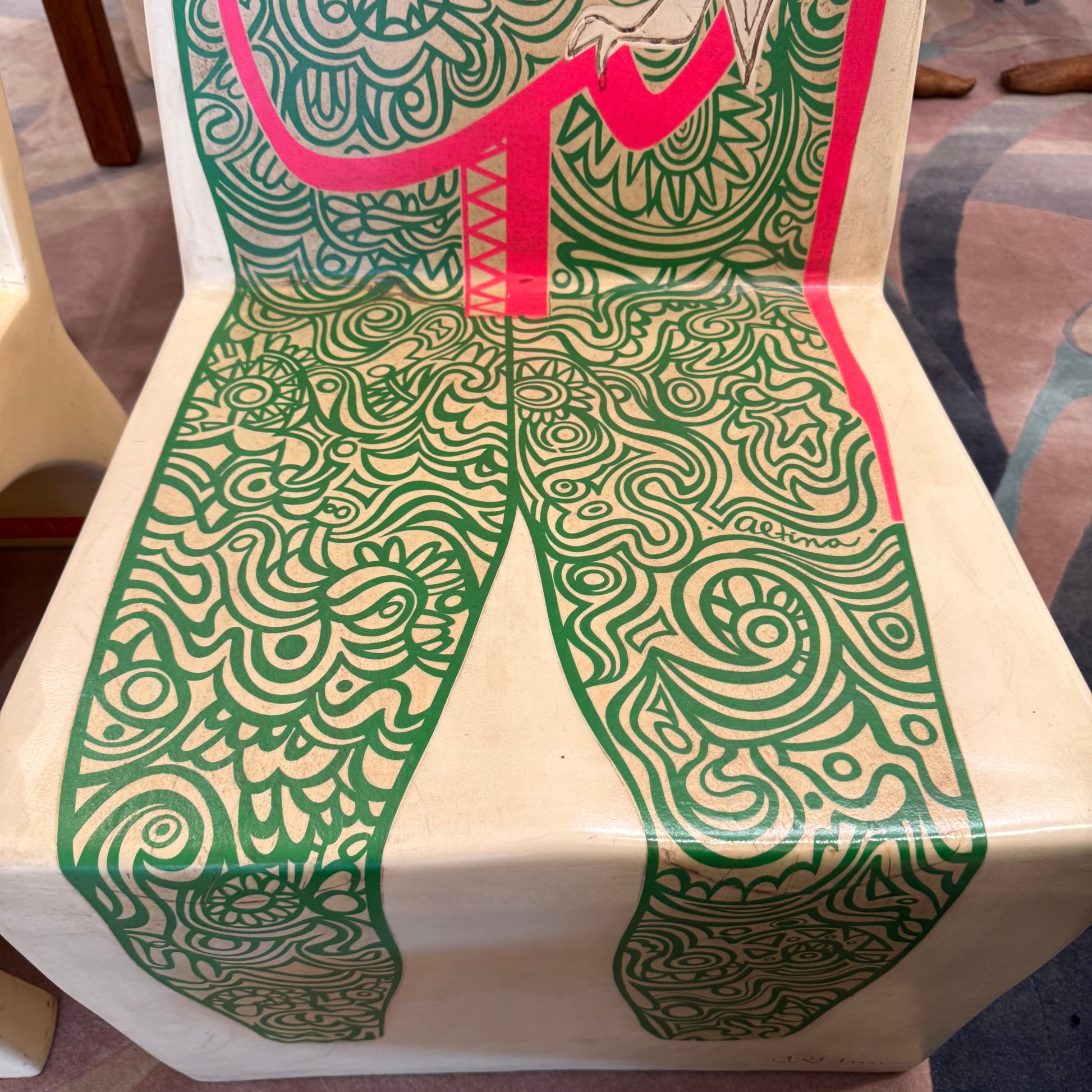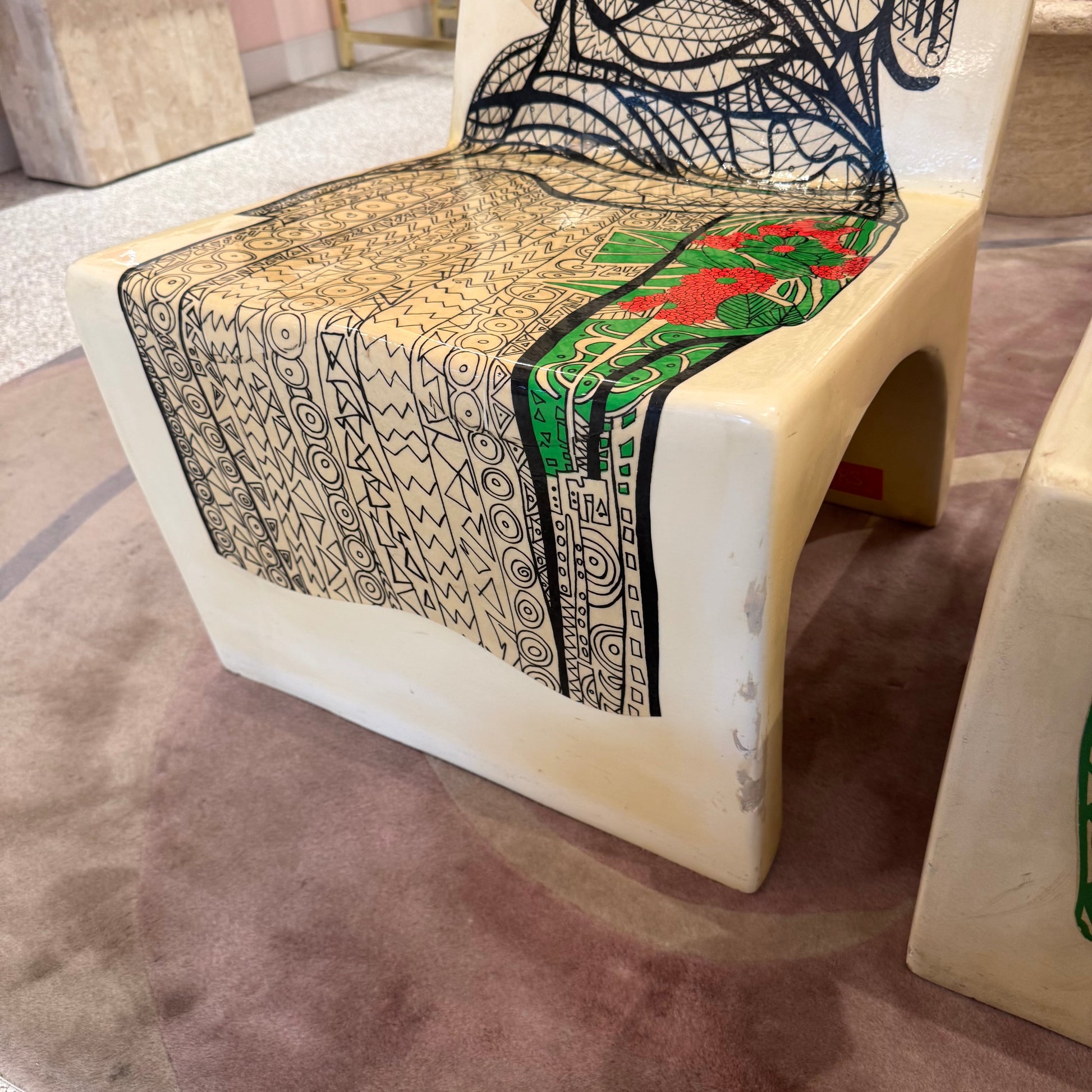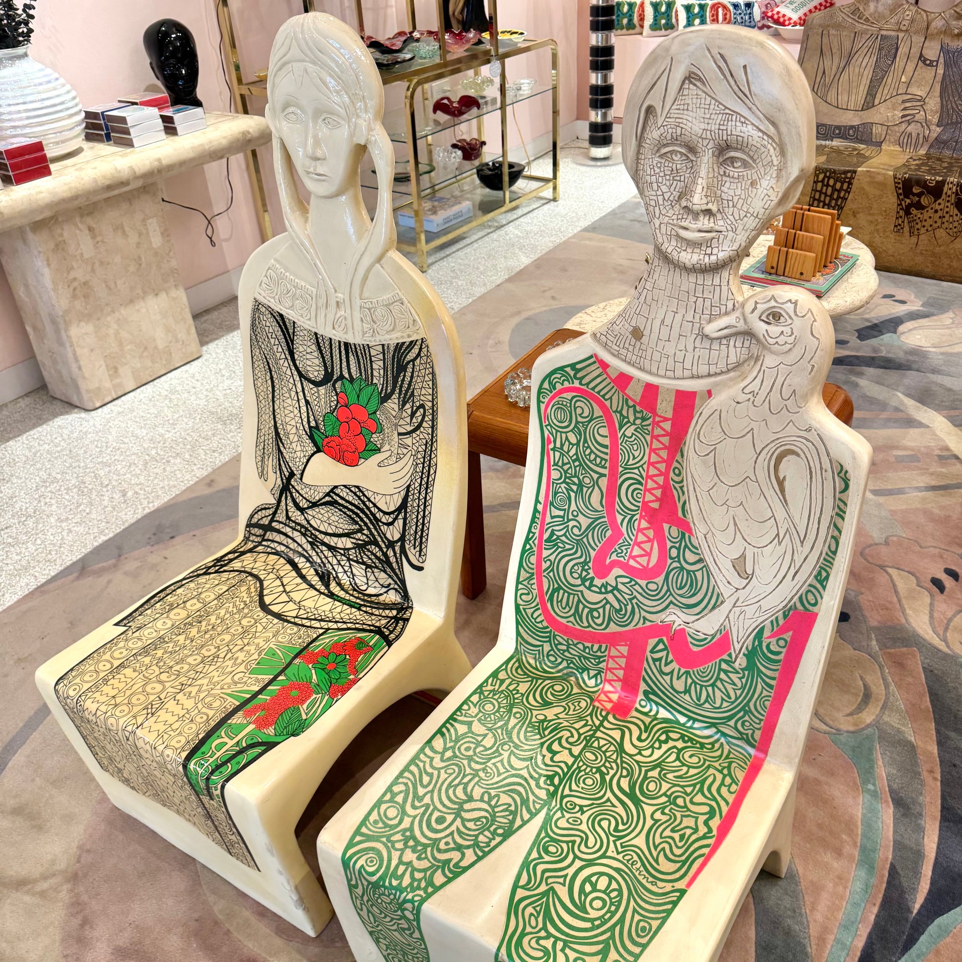 An absolutely spectacular pair of vintage figural "Chairacter" chairs, by Altina Schinasi, c.1970's. The woman chair features an intricately detailed illustrated black lace dress and vibrantly colored red and green flowers, with a 3D neckline, face and hair. The man chair features green and pink colored illustrated clothing. He is seen holding a 3D bird with gold accents. The front and back of his face and hair are 3D with intricate detailing. Each chair is constructed of beige colored fiberglass. The woman chair has a slightly more shiny finish than the man chair.