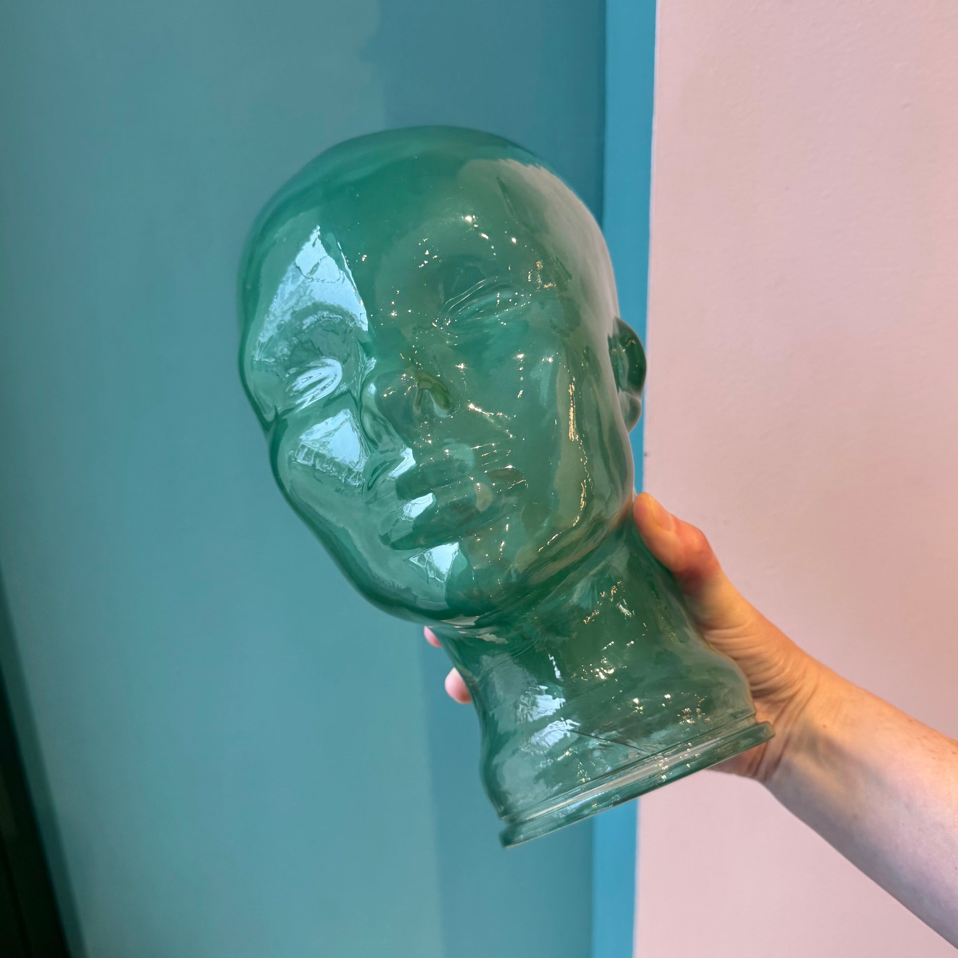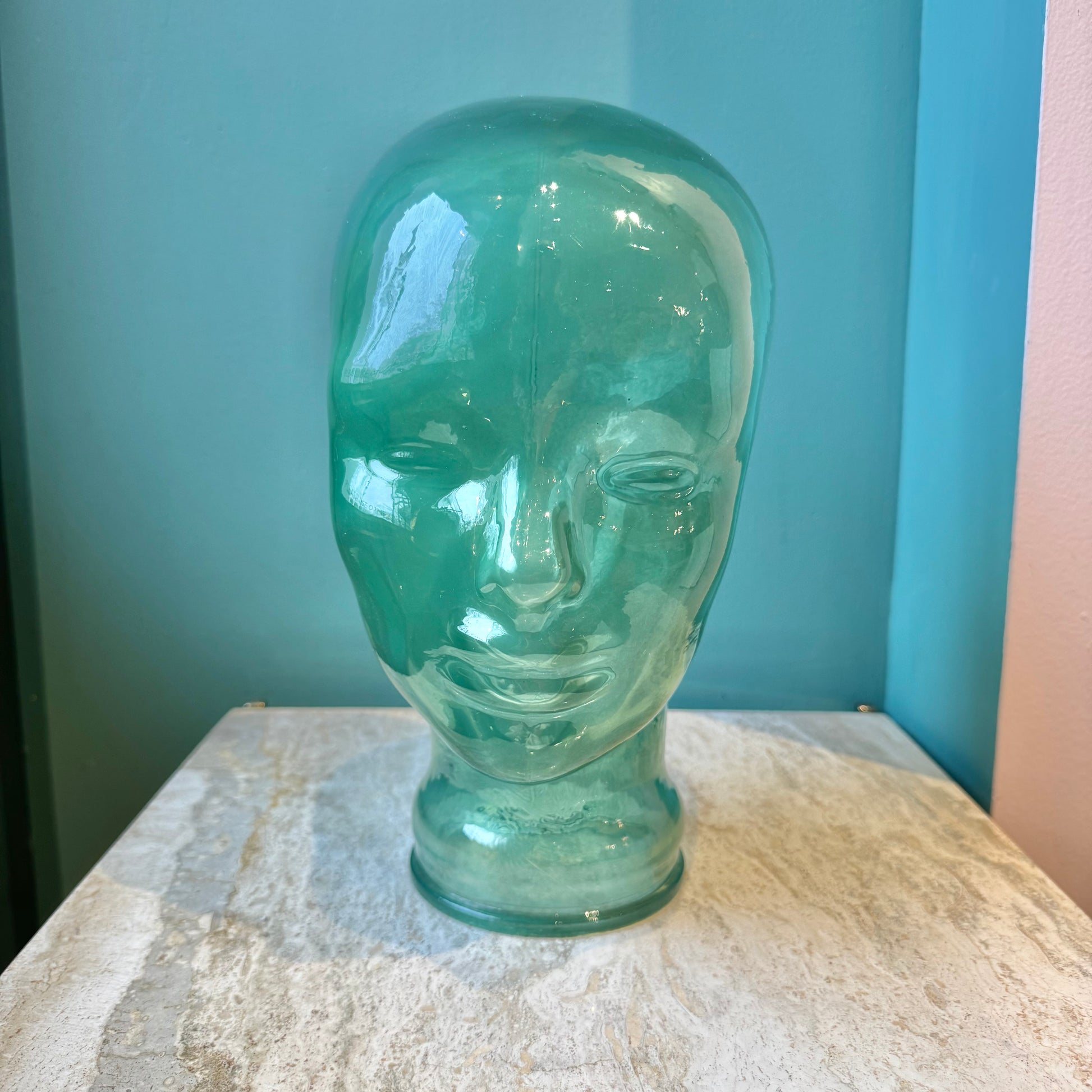 A stunning sea foam green colored glass head, made in Spain circa 1980’s. Perfect as a display piece for hats or simply for decorative purposes. Approx life size.