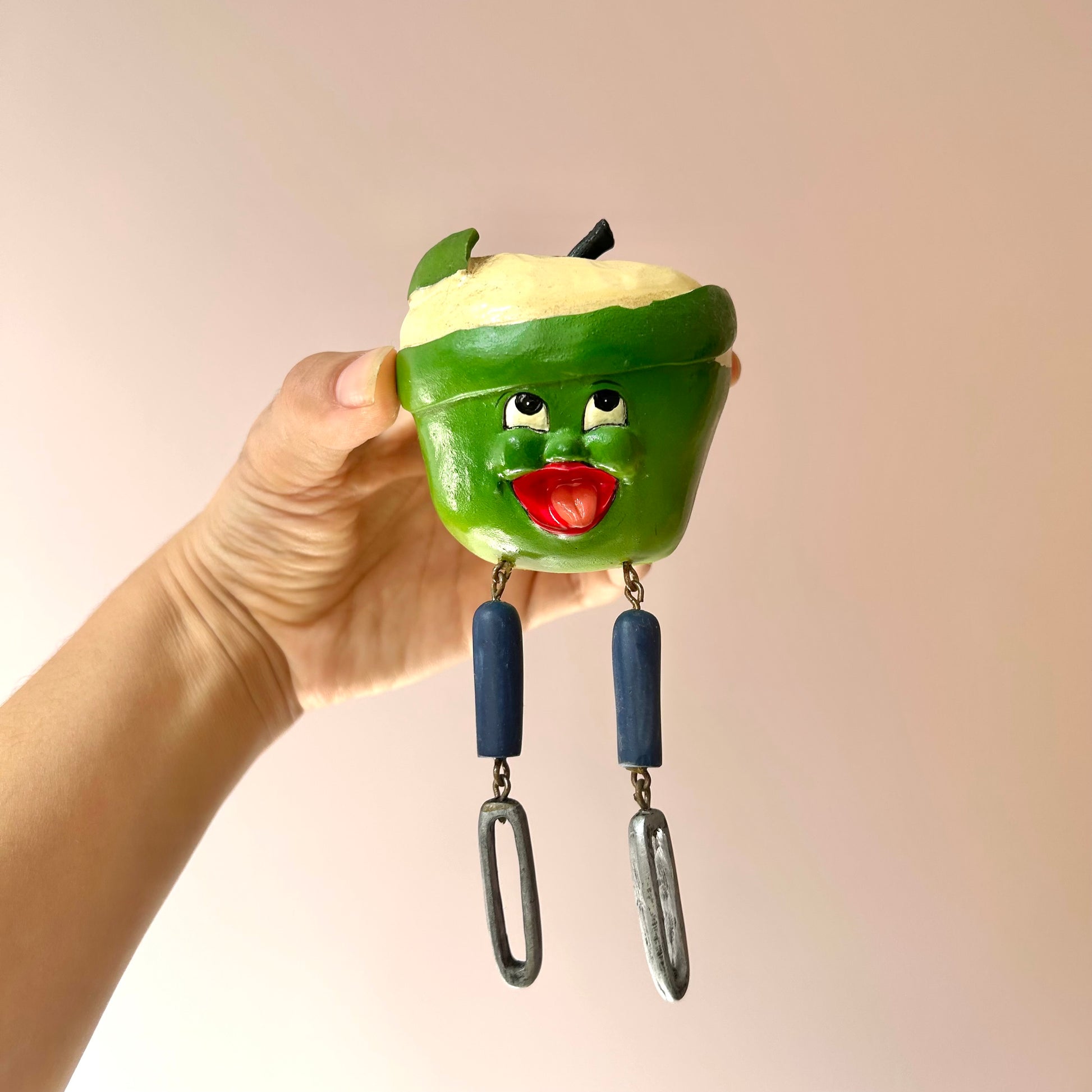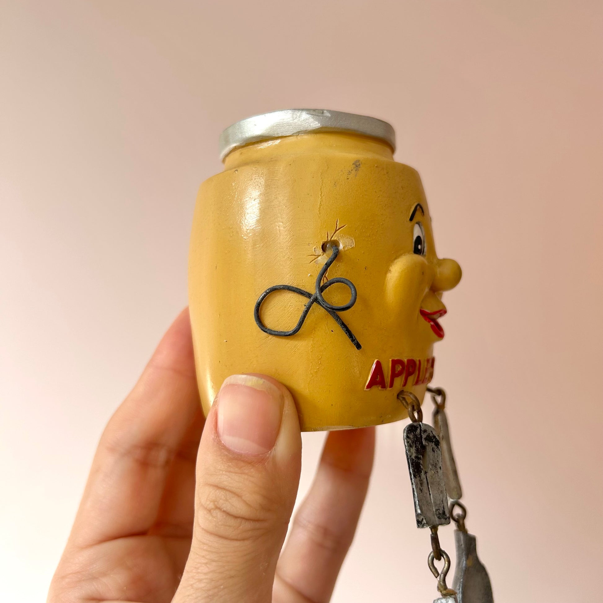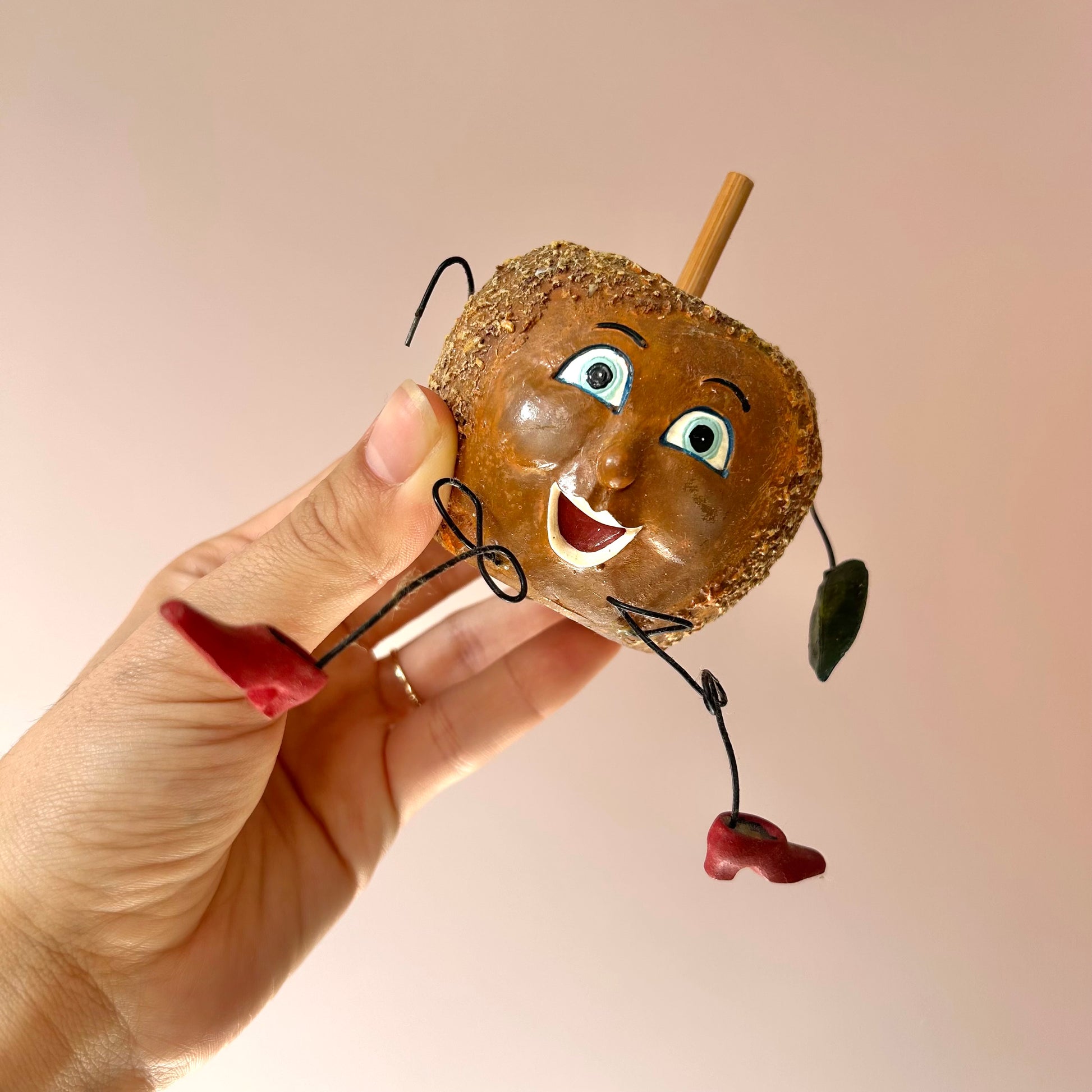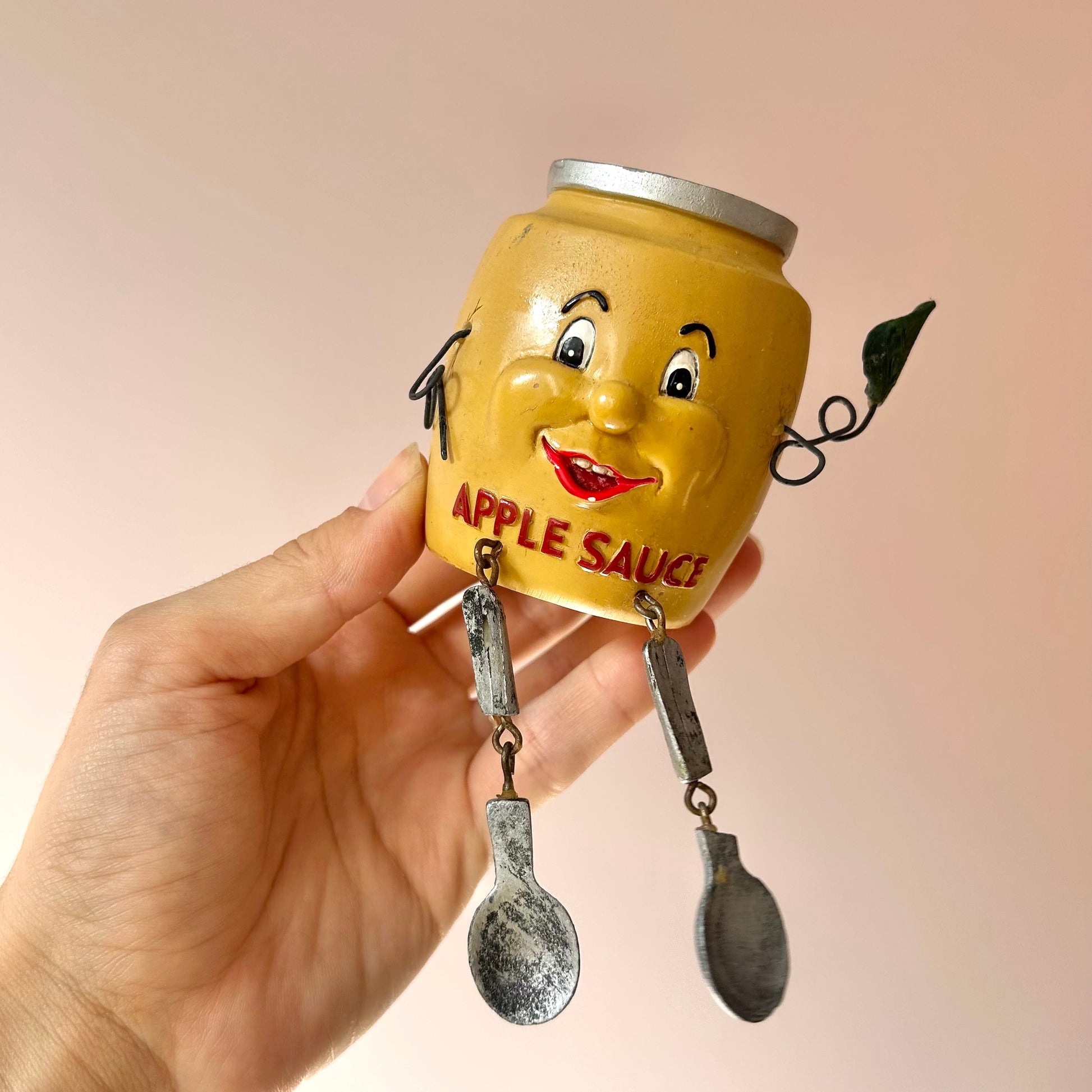 A fantastically whimsical set of 4 vintage shelf sitter figures in an apple theme . Each is highly detailed and wonderfully charming. Perfect for adding a little vintage whimsy to a kitchen or living room shelf. The characters featured are a green peeled apple, a jar of apple sauce, a caramel apple and a red apple. C.early 2000's.