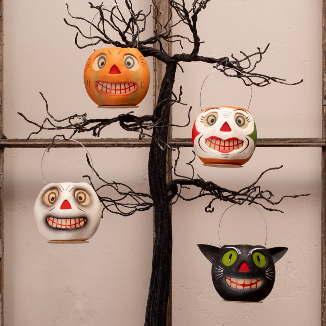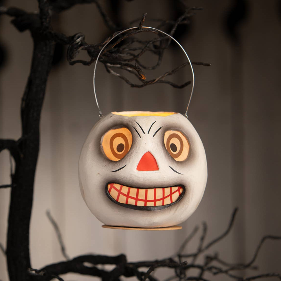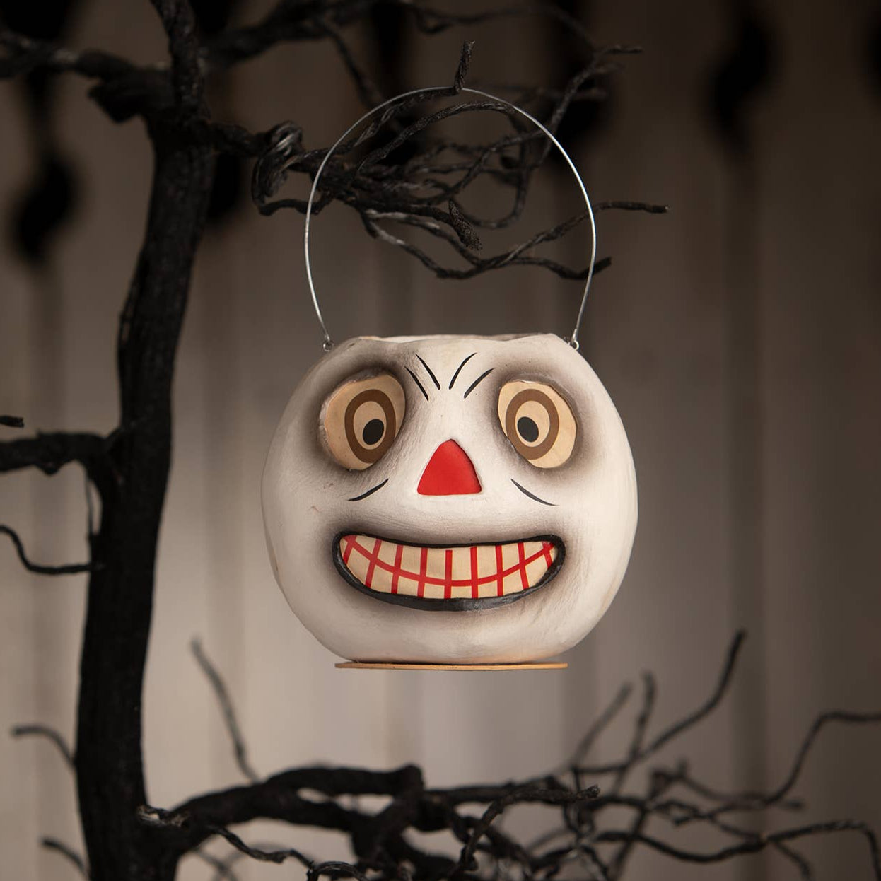 Add a touch of spooky charm to your halloween decor with our vintage inspired skeleton bucket! This delightful reproduction is crafted to resemble the original design, capturing the whimsical essence of classic halloween decor. Made from sturdy paper mache, this enchanting bucket features intricate skeleton details that bring a playful yet eerie vibe to any setting.