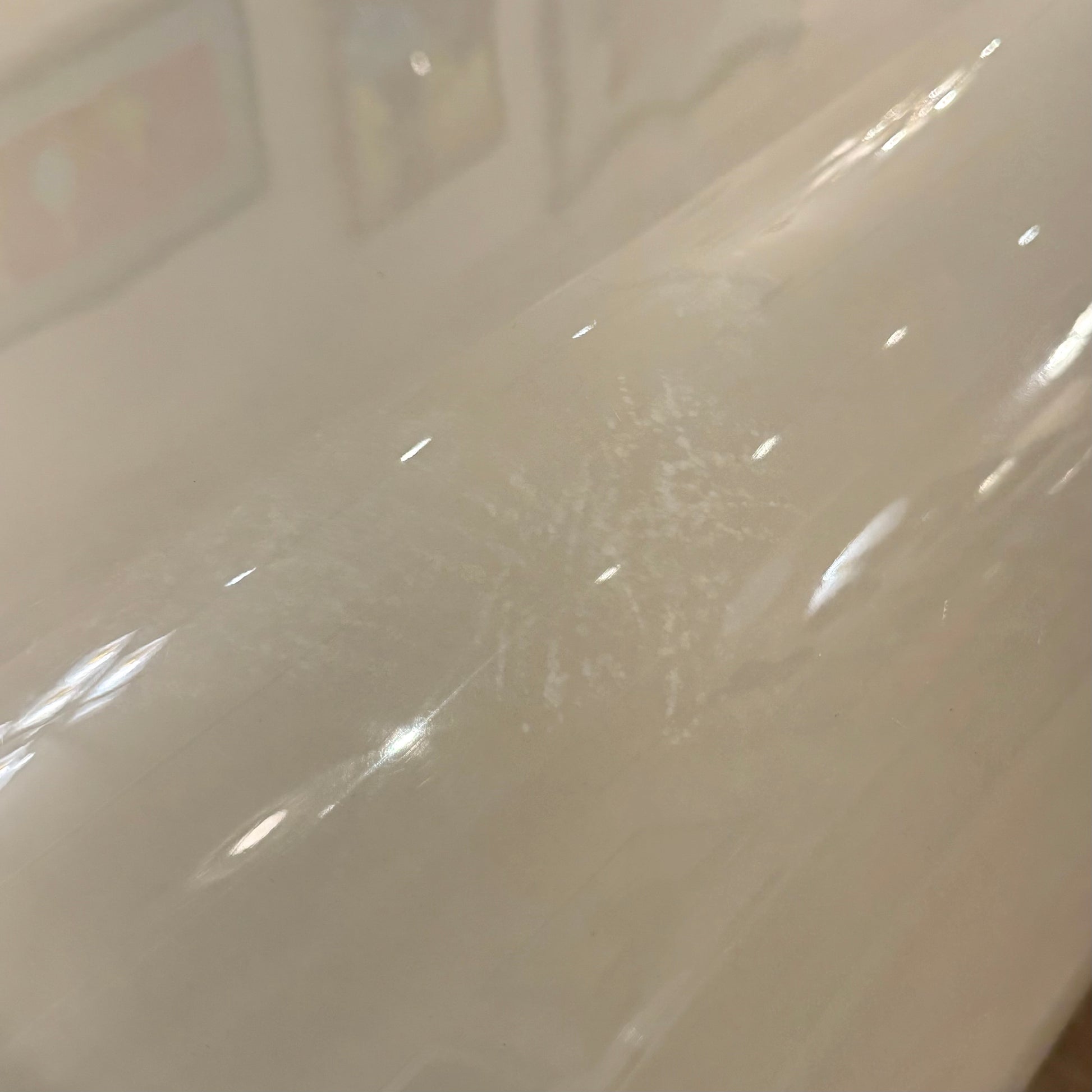 A sleek mid-century modern waterfall edge taupe colored coffee table with a lacquered finish, in the style of Karl Springer. C.1970's.