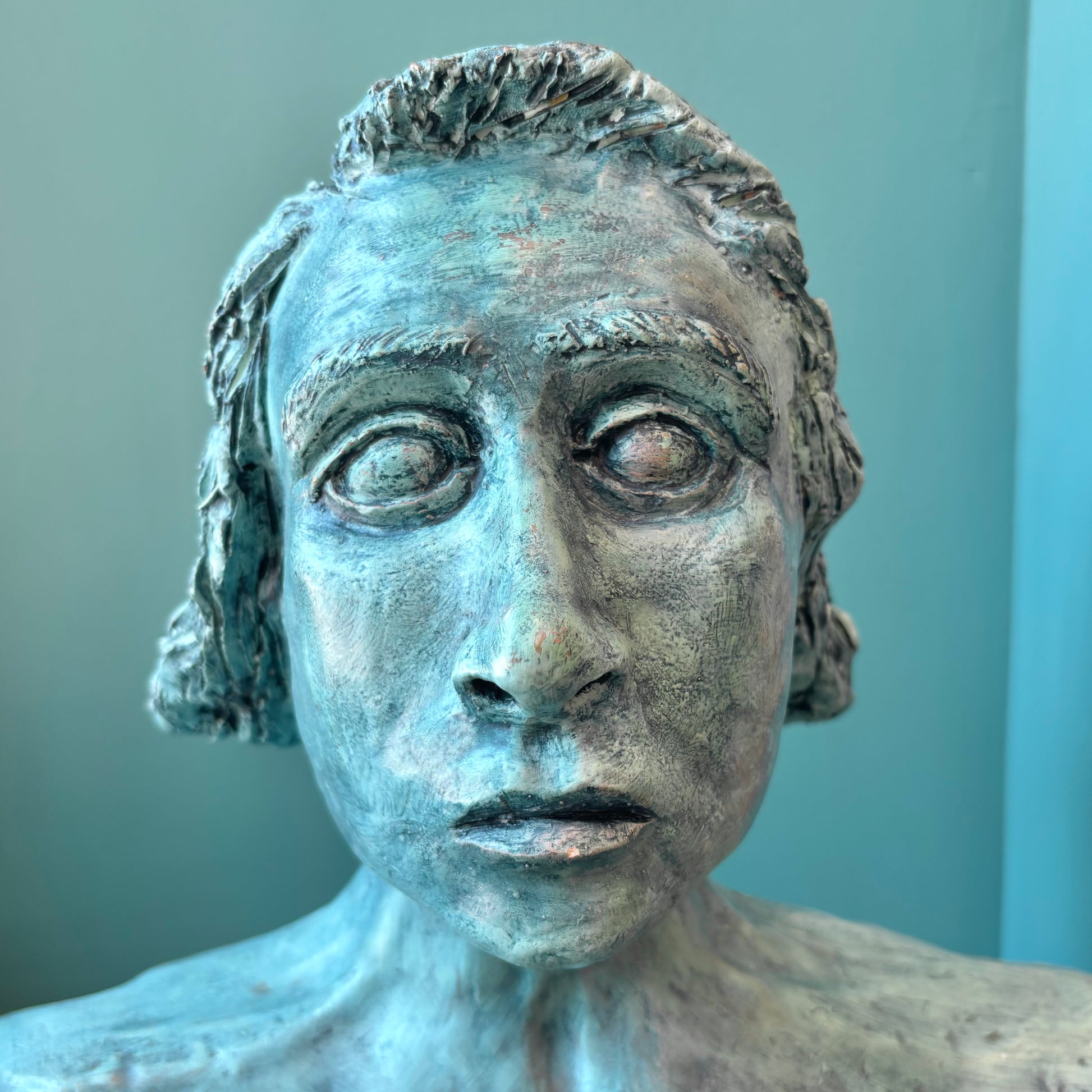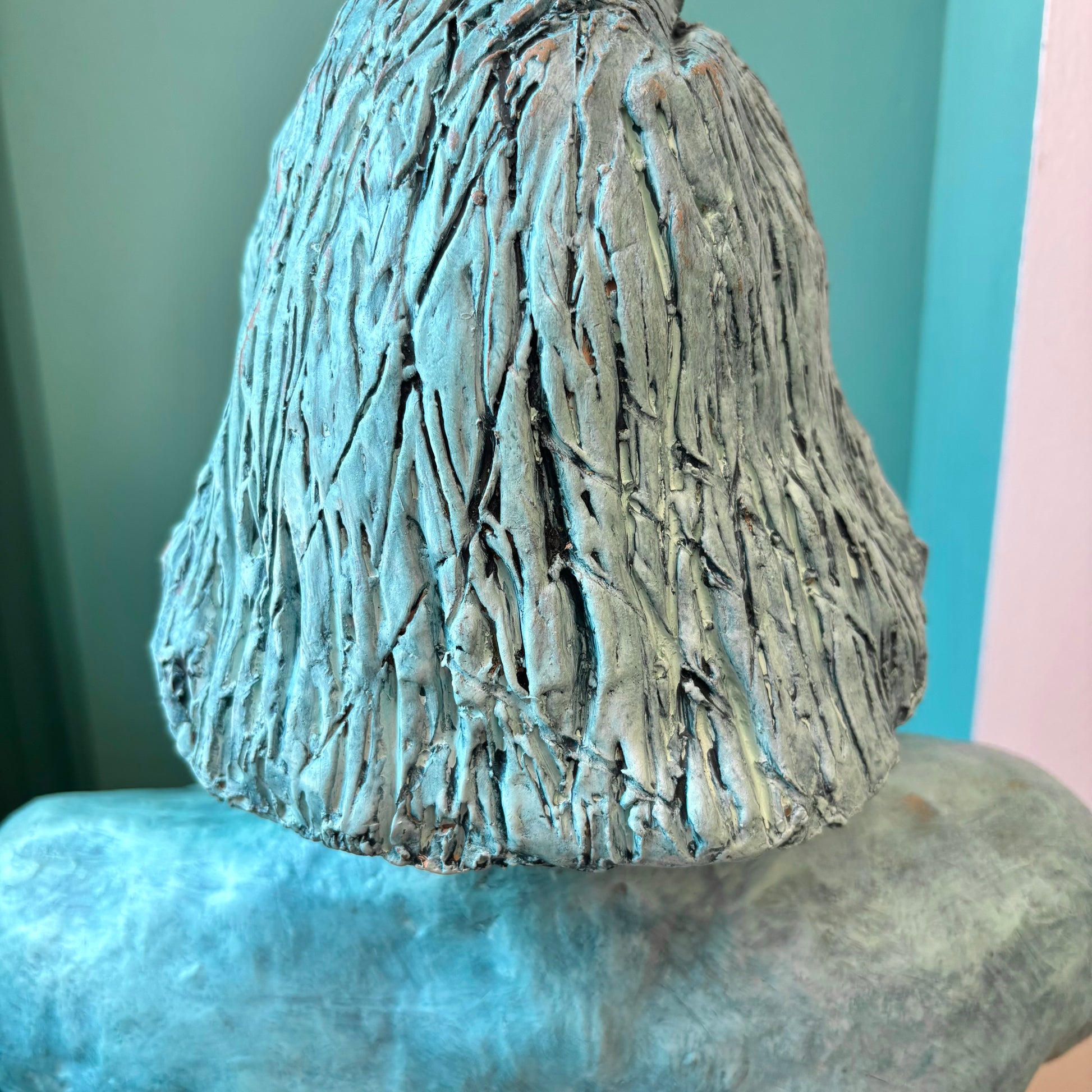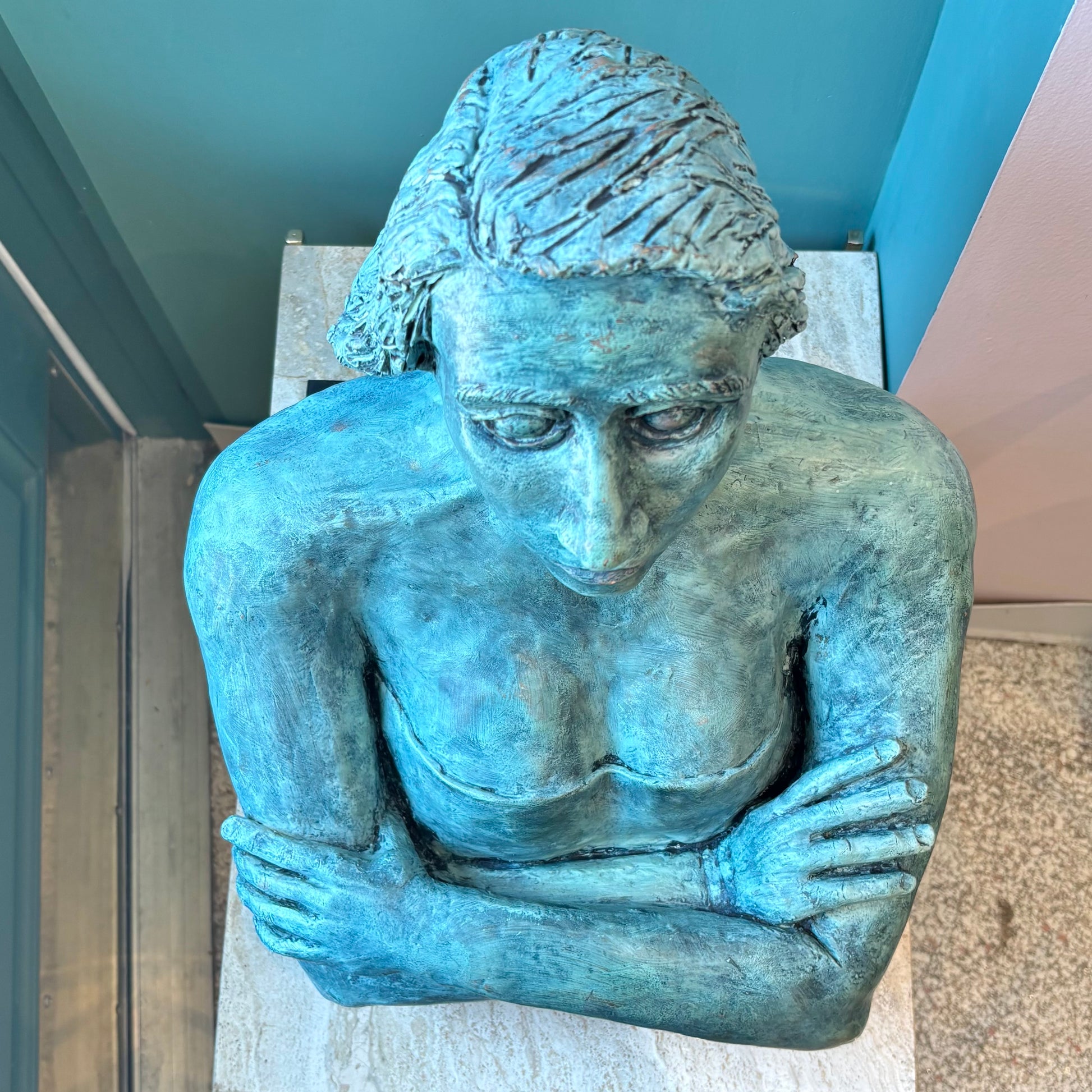 A beautiful vintage terracotta woman bust sculpture, painted teal blue, giving it the appearance of oxidized copper, on a black wooden base. This is a heavy piece only available for in store pick-up or local delivery. Artist unknown.