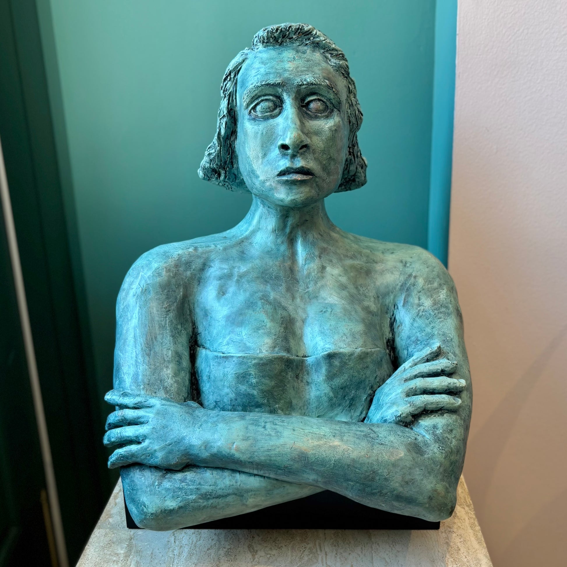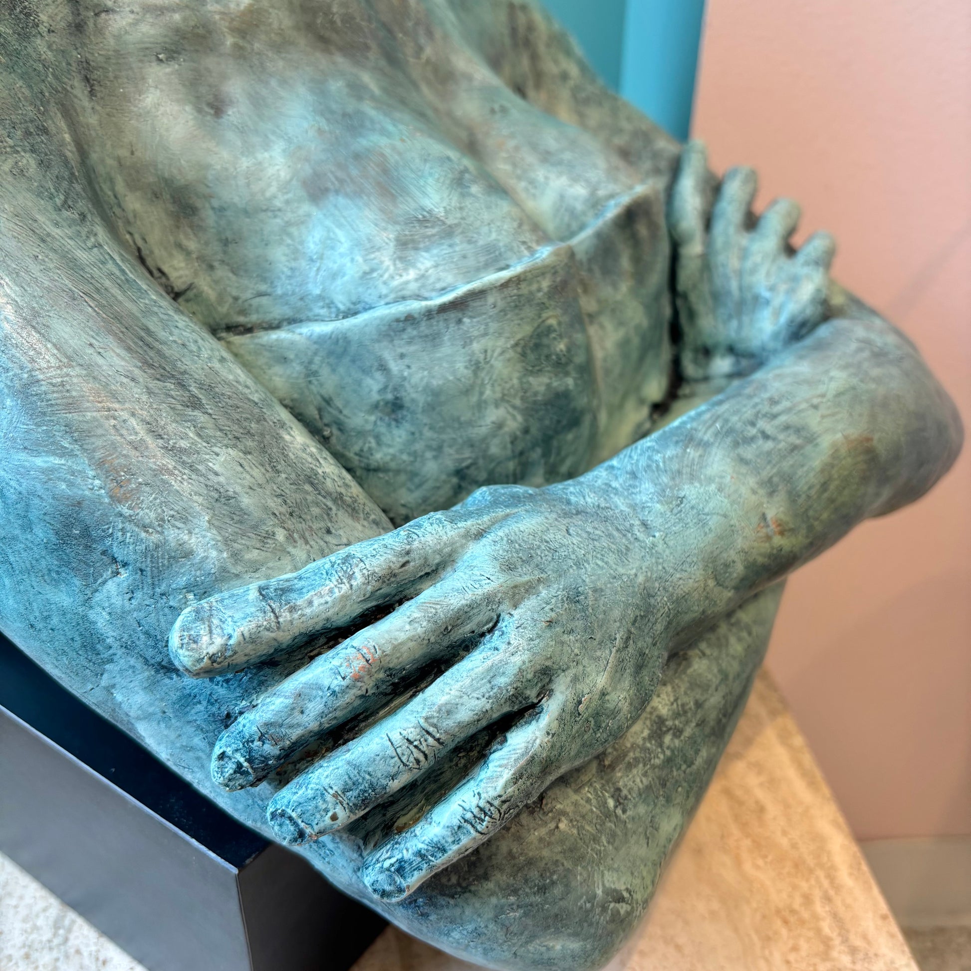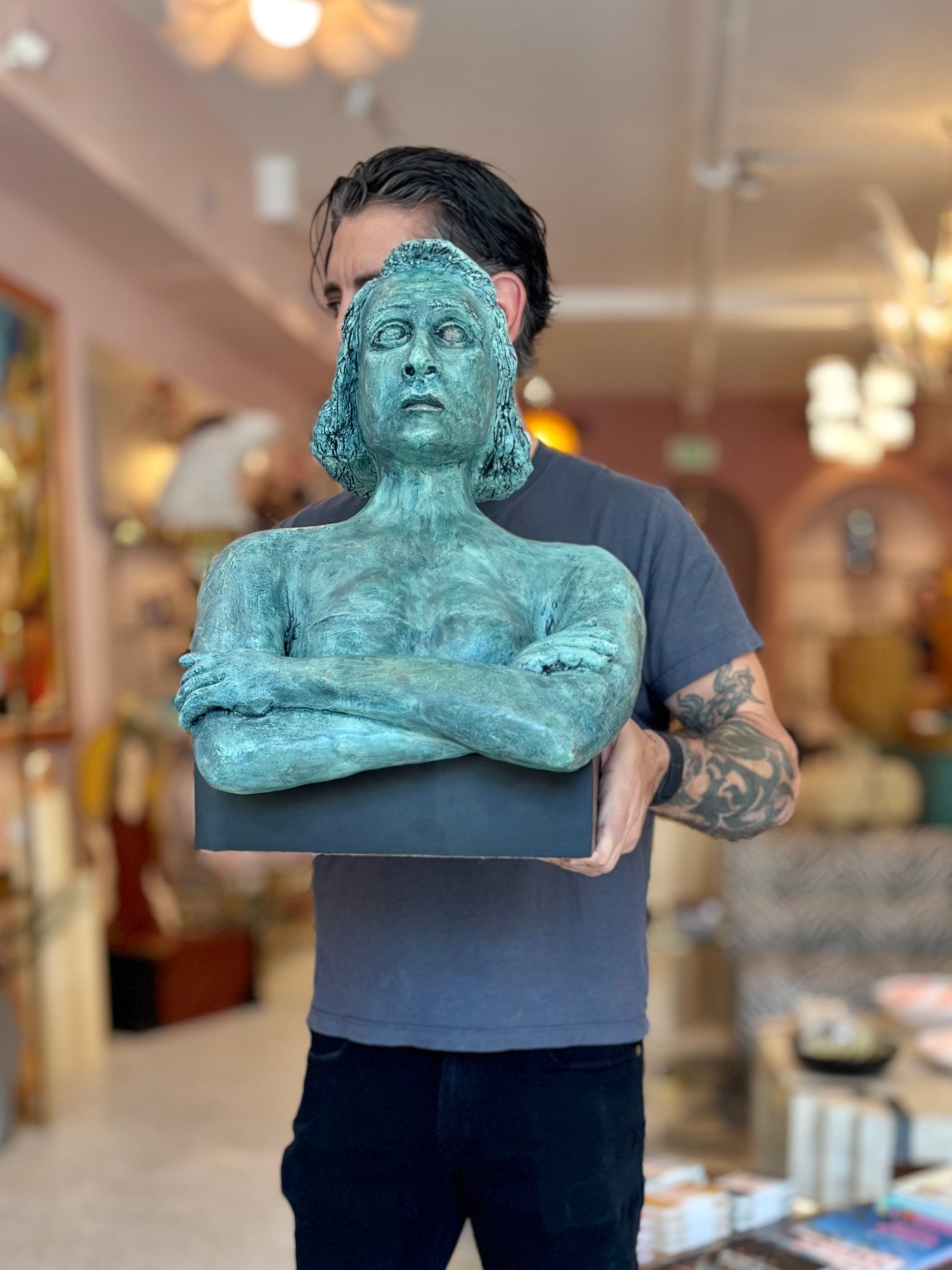 A beautiful vintage terracotta woman bust sculpture, painted teal blue, giving it the appearance of oxidized copper, on a black wooden base. This is a heavy piece only available for in store pick-up or local delivery. Artist unknown.
