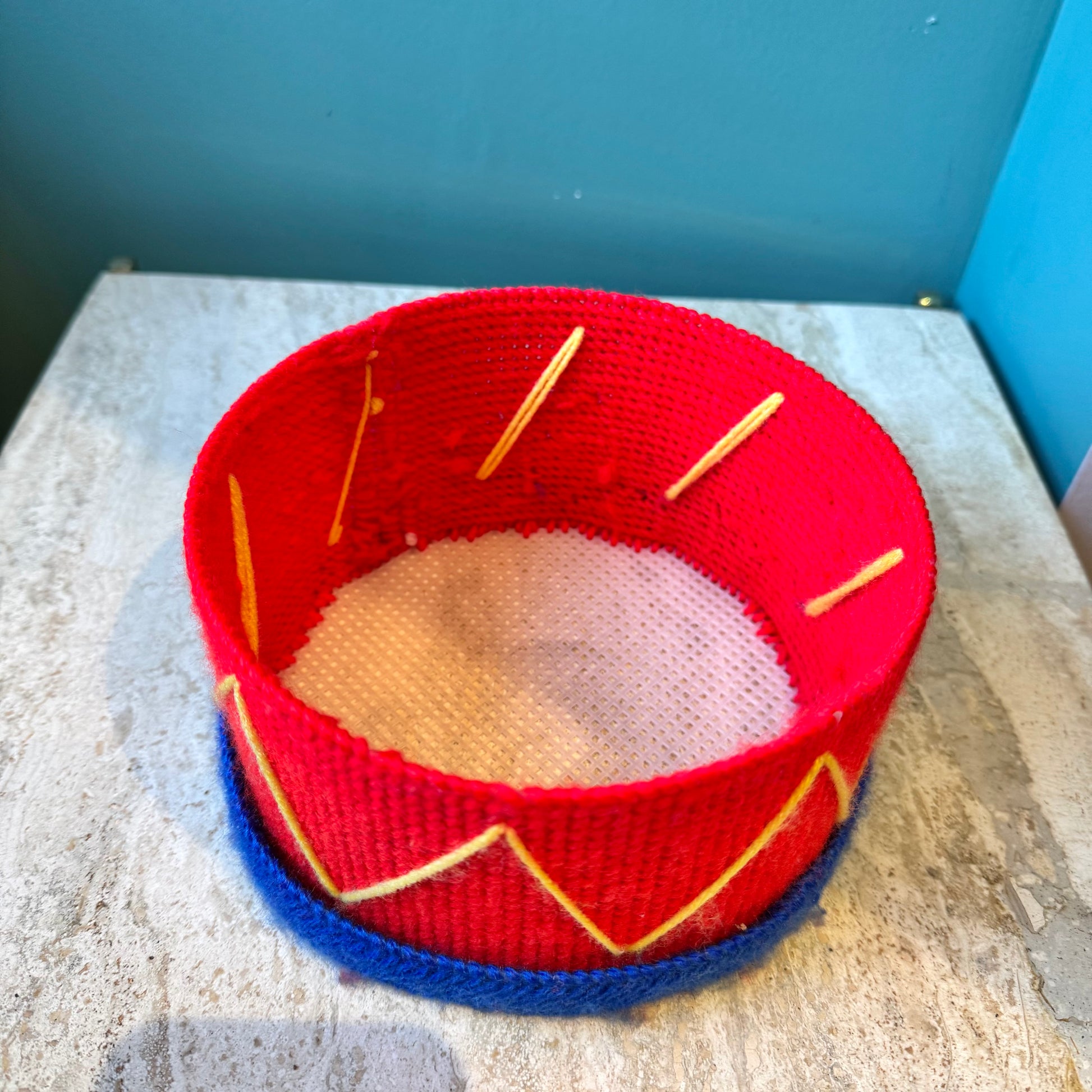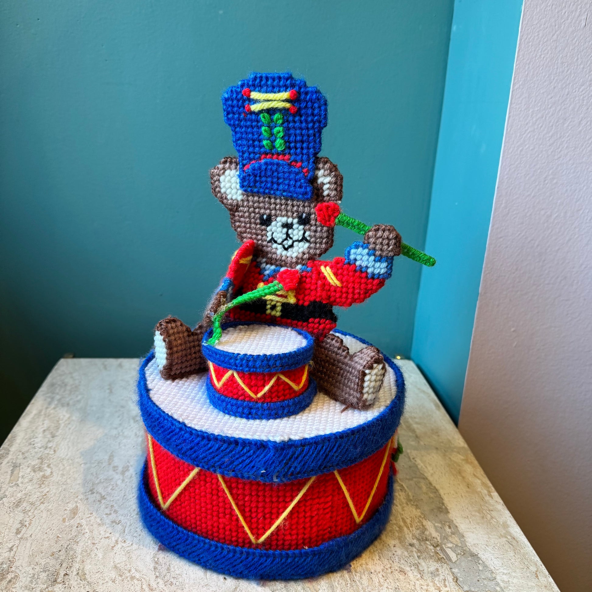 Adorable vintage crochet and plastic drummer bear box. Circa 1980/1990's.
